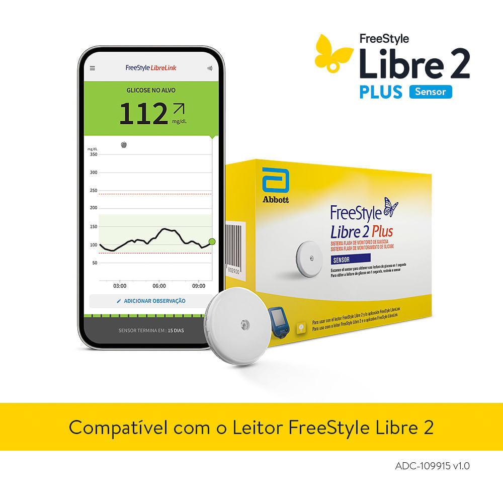 O sensor FreeStyle Libre 2 Plus permite uma experiência coesa sem picadas nos dedos II , sem calibração do usuário e sem entrada de código.