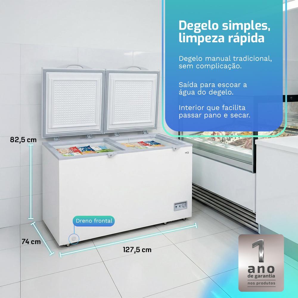 Freezer e Conservador Horizontal HQ 2 Portas 400 Litros Branco HQ-400CF2DX Se o seu negócio ou sua casa precisa de muito espaço para congelar sem desperdiçar energia, o Freezer Horizontal HQ-400CF2DX (400 L, porta dupla) foi pensado para isso. Ele une porta dupla, que reduz a perda de frio a cada abertura, com consumo aproximado de 41,17 kWh/mês. Com 400 litros dedicados a congelamento, ele é o parceiro ideal de restaurantes, bares, padarias, minimercados, conveniências e de famílias grandes que compram em atacado e precisam estocar com segurança. A porta dupla permite organizar os produtos por tipo ou giro, deixando sempre à mão o que sai mais, sem “abrir o freezer inteiro” toda vez. O controle é mecânico, simples e direto, e o sistema de degelo manual garante confiabilidade e baixo índice de manutenção. Tudo isso em um gabinete robusto, preparado para operar em clima quente (tipo T), com refrigerante R600a e agente de expansão ciclopentano, alinhados às normas ambientais. No dia a dia, o resultado é claro: estocagem de alto volume com operação mais eficiente, menos perda de frio, consumo enxuto e um fluxo de trabalho mais organizado na cozinha, no estoque ou na área de serviço. Por que isso importa no dia a dia Porta dupla que trabalha a seu favor Abra só o lado necessário, reduza a troca de ar com o ambiente e ajude a manter a temperatura interna mais estável, com menos esforço do compressor. 400 L de capacidade com cara de estoque profissional Volume ideal para negócios de alimentação e famílias grandes, permitindo compras em maior quantidade sem lotar a geladeira principal. Com aproximadamente 41,17 kWh/mês de consumo é um aliado importante para reduzir custos fixos em operação contínua. Organização de produto por lado use um lado para carnes, outro para congelados prontos; ou separe por giro de vendas. Isso agiliza o atendimento e diminui o tempo com a tampa aberta. Freezer dedicado para congelar de verdade Temperatura interna de congelador, própria para armazenamento prolongado, mantendo textura e segurança dos alimentos congelados. Degelo manual pensado para a rotina Sistema simples, sem eletrônica complexa: ao longo do tempo, o degelo é feito manualmente, com escoamento facilitado da água, ajudando na limpeza. Instalação estável e segura Dimensões equilibradas e pés frontais ajustáveis facilitam o nivelamento, garantindo fechamento correto das tampas e evitando entrada de ar quente. Especificações Técnicas Marca: HQCor: BrancoCapacidade total: 400 LitrosModelo: HQ-400CF2DXVoltagem: 127 V ou 220 V(Não é Bivolt)Portas / tampas: 2 tampas superiores independentes.Frequência: 60 Hz.Consumo aproximado: 41,17 kWh/mêsTemperatura do compartimento congelador: até -18 °C (uso como congelador).Tipo de degelo: Manual (degelo periódico).Dreno: saída de água de degelo pensada para facilitar a limpeza (apoio importante no degelo manual).Controle de temperatura: Termostato mecânico com ajuste de temperatura.Base / nivelamento: Pés frontais ajustáveis para nivelamento adequado em diferentes tipos de piso.Cesto interno: Cesto aramado removível para itens de giro rápido e organização do topo.Gás Refrigerante: R600aAgente de expansão: Ciclopentano.Tipo climático: T (projetado para operar em regiões de clima quente). Dimensões e Peso do ProdutoAltura: 82,5 cmLargura: 127,5 cmProfundidade: 74 cmPeso: 55 kg Garantia01 Ano (Sendo 3 meses de garantia legal e mais 9 meses de garantia para defeito de fabricação).
