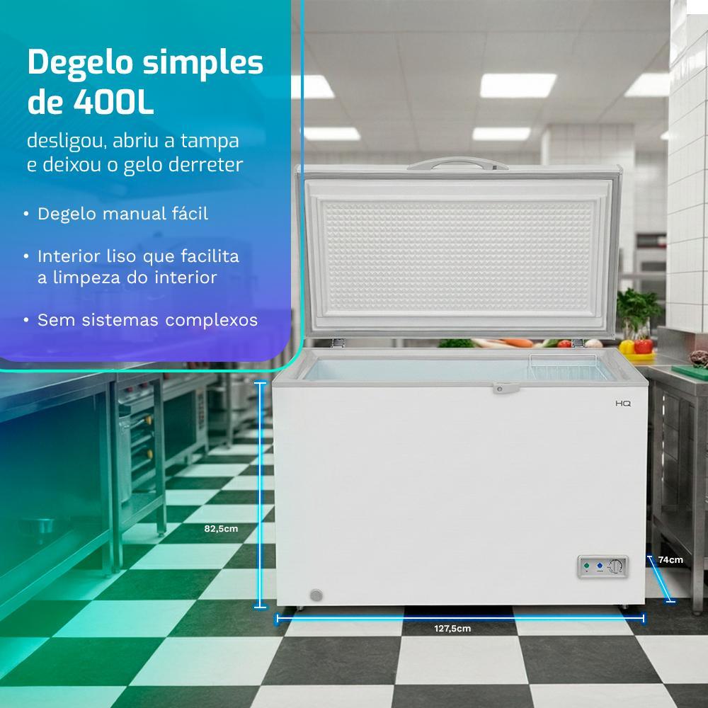 Freezer e Conservador Horizontal HQ 400 Litros Branco HQ-400CFXAlta capacidade para grandes estoques com baixo consumo.Se o seu negócio ou a sua casa precisa de estoque congelado em grande escala, o Freezer Horizontal HQ 400L HQ-400CFX foi feito para esse cenário. São 400 litros de capacidade em um gabinete robusto, pronto para receber grandes volumes de carnes, caixas de congelados, marmitas, sorvetes, gelo e tudo o que não cabe mais na geladeira – ou no freezer menor que você já tem.Com consumo aproximado de 41,12 kWh/mês, o HQ-400CFX foi pensado para ficar ligado o ano inteiro, ajudando a manter a conta de luz sob controle mesmo com o freezer sempre cheio. Para quem depende de produtos congelados todos os dias, isso significa mais espaço de sobra sem transformar o consumo em problema.O interior liso, o cesto aramado e a base com rodízios + pés ajustáveis transformam a rotina: é fácil organizar, encontrar produtos, limpar o gabinete e movimentar o equipamento quando necessário. Tudo isso com o reforço da trava externa na tampa e do puxador robusto, ideal para ambientes de alto giro.Para famílias grandes, pequenos comércios e empreendedores que precisam de um freezer grande, econômico e confiável, o HQ-400CFX equilibra capacidade, consumo e praticidade de uso contínuo em um único equipamento.Por que isso importa no dia a diaEconomia que se repete todo mêsO HQ-400CFX consome cerca de 41,12 kWh/mês na prática, isso significa um custo fixo mais baixo por litro de armazenamento, algo essencial para quem não pode desligar o freezer nunca.400 Litros para estocar muito maisSão 400 litros pensados para grande volume, cabe o reforço completo de carnes fracionadas, caixas de hambúrguer, pacotes de vegetais, polpas, sobremesas congeladas, gelo para eventos e promoções – sem apertar tudo no limite. Ideal para aliviar totalmente o congelador da geladeira ou substituir freezers menores.Organização fácil com cesto e bojo amploO bojo interno amplo recebe as caixas O cesto aramado deixa à mão tudo o que entra e sai o tempo todo: itens de giro rápido, marmitas do dia, porções menores.maiores, sacos e bandejas, permitindo criar uma lógica de organização clara entre estoque de fundo e produtos de uso imediato.Degelo manual simples e sem segredoO sistema de degelo é manual e direto, desligar, abrir a tampa, aguardar o gelo derreter e secar o interior com pano macio. Sem eletrônica escondida nem peças complexas, qualquer pessoa da casa ou da equipe consegue entender e executar o processo com segurança.Fácil de instalar, movimentar e nivelarOs 2 rodízios ajudam a mover o freezer na hora de limpar ou reorganizar o ambiente. Os 2 pés ajustáveis facilitam o nivelamento, evitando trepidações e garantindo melhor fechamento da tampa e desempenho do compressor – algo especialmente importante em pisos irregulares.Segurança, conforto e durabilidadeA trava externa na tampa aumenta a segurança em ambientes com circulação de pessoas. O puxador externo robusto aguenta o uso intenso do dia a dia. O gás R600a, o agente de expansão ciclopentano e o controle mecânico formam um conjunto confiável, eficiente e simples de manter.Cenários de uso doméstico e comercial de pequeno porteFamílias grandes que fazem compra do mês e precisam de muito espaço extra para carnes, congelados e marmitas.Pequenos mercados, mercearias e empórios que querem reforçar o estoque de congelados sem investir em câmaras frias.Restaurantes, bares, lanchonetes, pizzarias e hamburguerias com alto giro de produtos congelados.Negócios de delivery de marmitas, refeições prontas e sobremesas congeladas que dependem de estoque constante.Casas de praia, sítios e chácaras que recebem muitas pessoas em finais de semana e feriados.Refeitórios corporativos, cozinhas industriais de menor porte e cozinhas de apoio que precisam de um equipamento de suporte confiável.Itens na embalagem1 Freezer Horizontal HQ 400L HQ-400CFX1 cesto aramado.1 Manual de instruções.1 Certificado de Garantia.Especificações TécnicasMarca: HQModelo: HQ-400CFXCor: BrancoVoltagem: 12V ou 220V (Não é Bivolt)Capacidade: 400 LitrosTipo: Freezer HorizontalDegelo: ManualControle de temperatura: MecânicoConsumo aproximado de energia: 41,12 kWh/mês.Gás Refrigerante: R600aAgente de expansão: CiclopentanoBase: 2 rodízios + 2 pés ajustáveisCesto: 1 cesto aramadoPuxador: ExternoTrava na tampa: Sim (externa)Dimensões e Peso do ProdutoAltura: 82,5 cmLargura: 127,5 cmProfundidade: 74 cmPeso: 55 kgGarantia01 Ano (Sendo 3 meses de garantia legal e mais 9 meses de garantia para defeito de fabricação).