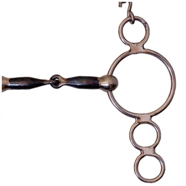 Freio Bridão Neco inox 4 Argolas bocal de ferro, hastes articuladas, com formato de argolas fabricada em aço inox, livre de ferrugens, possibilitando usar a rédea em ambas argolas deixando- a com ação leve ou pesada. Bocal em aço inox banhado em ferro para auxiliar o animal na salivação. Bocal com acabamentos em bolinha não permitindo que o animal belisque a boca. Modelo levantador Medidas Aproximadas: Comprimento da haste: 18 cm Comprimento do bocal: 12 cm Espessura do bocal: 1,5 cm Diâmetro da argola maior: 6,7 cm Diâmetro da argola menor: 2,7 cm