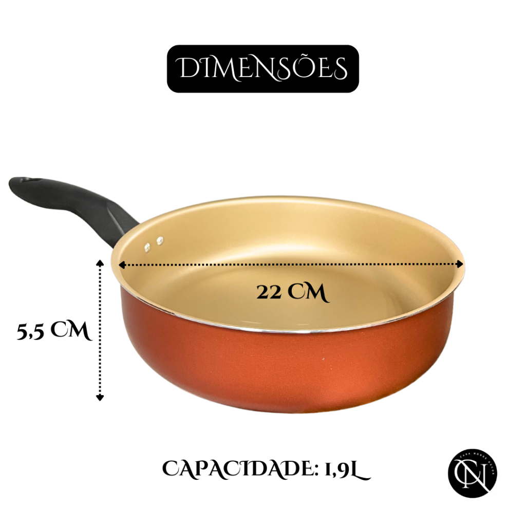 Seja Bem-Vindo a Casa Nobre ! Frigideira 22cm com 5 camadas de Teflon Antiaderente com Tampa de Vidro + Espátula Nylon Tudo que uma cozinha moderna precisa está aqui na Outlet Edular + Praticidade no seu dia a dia Não gruda Fácil de limpar - Especificações do Produto *Frigideira 22 cm Antiaderente, tampa de vidro temperado com saída de vapor; *Alumínio de alta qualidade, espessura de 1,1 mm, que confere ao item uma estrutura resistente garantindo a durabilidade e distribuição eficiente do calor; *Revestido com 5 camadas de antiaderente TEFLON - PFOA Free, internamente e externamente; *Possui cabo reforçado, feito em baquelite, material antitérmico que não retém calor, para garantir máxima segurança no manuseio; *Revestimento externo: Antiaderente - *Revestimento interno: Antiaderente - - Dimensões aproximadas - cm: (Comprimento x Largura x Altura - Capacidade volume): *Frigideira 22 cm de diâmetro - 38 x 23 x 05,5 cm – 1,9L - Recomendações: *Antes do primeiro uso é necessário realizar a limpeza e a cura do item, indispensável para durabilidade e proteção do antiaderente. Lave com esponja macia e detergente neutro, seque-a com um pano limpo. Unte a parte interna com óleo ou outra gordura e leve-a ao fogo baixo por 3 minutos. Deixe-a esfriar, lave, enxugue e está pronta para utilizar; *Utilizar somente espátula de nylon ou silicone para maior durabilidade do Teflon; *Não pode ser levado ao forno e/ou microondas; *Nunca use esponja de aço e objetos metálicos; *Pode ser usada em lava-louças e ir á geladeira. - Itens inclusos *Frigideira 22cm Antiaderente *Tampa de vidro temperado *Espátula Nylon * mimo :) * - Garantia de 30 dias contra defeitos de fabricação - Qualquer dúvida estamos à disposição :D