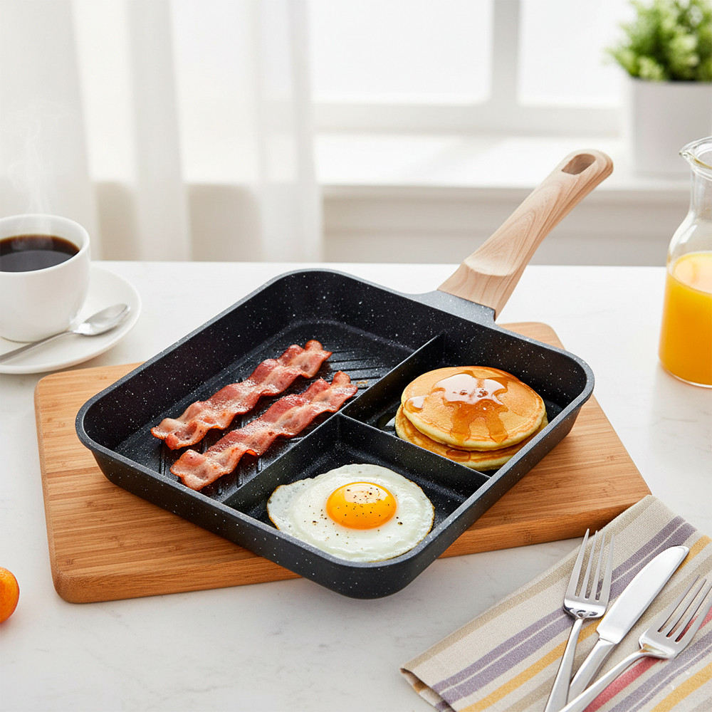 Frigideira Grelha Antiaderente 3 em 1 (3 Furos) XY127 para Ovo e Bife, Utensílio de Cozinha Fundo Grosso, Compatível com Fogão a Gás e Indução 1. Design 3 em 1 para Eficiência no Café da Manhã: Esta frigideira é especialmente desenvolvida com 3 seções separadas, permitindo cozinhar diversos itens (como ovos, omeletes, panquecas e carnes) ao mesmo tempo. Otimiza o seu tempo e esforço, tornando o preparo de várias porções rápido e prático. 2. Revestimento Duplo de Mármore Antiaderente: O interior possui 2 camadas de revestimento de mármore antiaderente de alta qualidade, garantindo que os alimentos não grudem e facilitando imensamente a limpeza. O revestimento exterior é de mármore/laca resistente ao calor, aumentando a durabilidade. 3. Construção Die Casting de Alta Qualidade: Fabricada pelo processo de fundição sob pressão (Die Casting), a frigideira tem um corpo robusto com fundo grosso que assegura aquecimento uniforme e resistência. O design de alta qualidade (High Quantity XY127) é anti-desgaste e durável. 4. Ampla Compatibilidade de Cooktops: Desenvolvida para uso geral, é totalmente compatível com diferentes tipos de fogões, incluindo fogão a gás e cooktop de indução, adaptando-se a diversas cozinhas. 5. Segurança e Manuseio Confortável: Apresenta um cabo com design ergonômico, anti-escaldante e antiderrapante, que não aquece, garantindo segurança e conforto ao manusear. O design do cabo robusto contribui para a durabilidade e uso prolongado. Garantia 90 dias