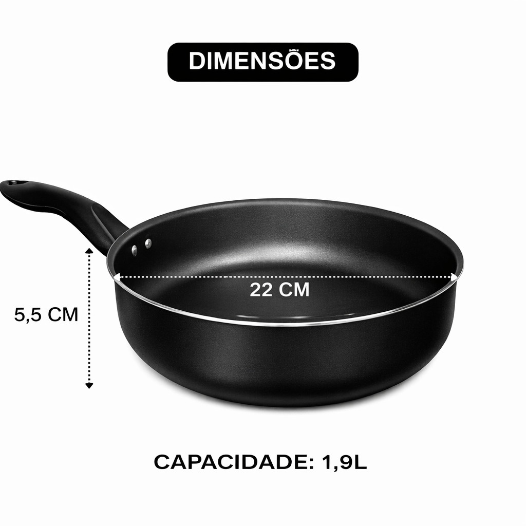 🍳 Frigideira Alta 22 cm Antiaderente com Tampa de Vidro – Preto Grafite A escolha perfeita para quem busca eficiência, durabilidade, praticidade e beleza na cozinha! Ideal para preparar desde o café da manhã com ovos perfeitos até pratos grelhados e receitas elaboradas para o jantar. Um item versátil que transforma o preparo das refeições em uma experiência ainda mais prazerosa. A Frigideira Alta 22 cm conta com tampa de vidro temperado, saída de vapor e borda em aço inox, permitindo acompanhar o cozimento dos alimentos com praticidade e segurança. Além de funcional, seu design moderno e sofisticado valoriza a decoração da cozinha. ⭐ Principais Benefícios ✔ Alumínio de alta qualidade (1,1 mm de espessura) Proporciona estrutura resistente, alta durabilidade e excelente distribuição de calor, garantindo um cozimento rápido e uniforme. ✔ Revestimento antiaderente premium – 5 camadas TEFLON (DuPont) Livre de PFOA (sem substâncias tóxicas), evita que os alimentos grudem, facilita a limpeza e permite cozinhar com menos gordura, promovendo uma alimentação mais saudável. ✔ Cabo ergonômico em baquelite antitérmico Não aquece durante o uso, oferecendo mais conforto e segurança no manuseio. ✔ Espátula de Nylon inclusa Ideal para preservar o revestimento antiaderente e aumentar a vida útil do produto. Um cuidado que faz toda a diferença! 📦 Conteúdo da Embalagem 1 Frigideira Alta 22 cm com tampa de vidro 1 Espátula de Nylon 📐 Especificações Técnicas Diâmetro: 22 cm Altura: 5 cm Comprimento total: 40 cm Capacidade: 2 Litros Material: Alumínio com revestimento antiaderente Teflon Cor externa: Preto Grafite Cor interna: Preto Grafite Espessura do material: 1,1 mm Cabo: Baquelite Tampa: Vidro temperado com saída de vapor Peso do produto: 723 g Dimensões da embalagem: AxLxC: 9 x 26 x 35 cm Peso da embalagem: 120 g (caixa parda) 🔥 Antes do Primeiro Uso – Limpeza e Cura Para garantir a durabilidade do revestimento antiaderente: Lave com esponja macia e detergente neutro Seque com pano limpo Unte levemente a parte interna com óleo Leve ao fogo baixo por 2 minutos Deixe esfriar, lave novamente, seque e pronto para usar 🧼 Cuidados e Recomendações Lavar com detergente neutro e esponja macia Secar com pano seco e macio Não utilizar produtos abrasivos ou solventes Não lavar o produto ainda quente Utilizar apenas utensílios de nylon ou silicone Não levar ao forno ou micro-ondas Não expor cabos e alças diretamente ao fogo Utilizar sempre em fogo baixo ou médio (máx. 350 °C)
