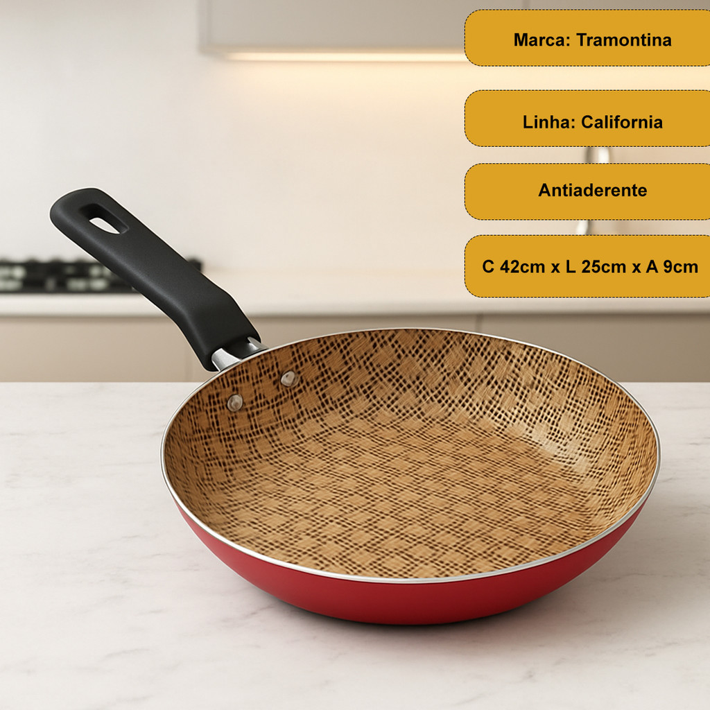 SEJA BEM-VINDO A ESTRELA DO LAR! Frigideira alumínio antiaderente Califórnia 24cm Tramontina Frigideira alumínio antiaderente Califórnia 24cm Tramontina - Prática e durável, ideal para receitas do dia a dia com revestimento antiaderente que evita grudar e facilita a limpeza. A Frigideira Tramontina Califórnia 24cm é a escolha perfeita para quem busca praticidade, resistência e eficiência na cozinha. Produzida em alumínio de alta qualidade, garante aquecimento rápido e uniforme, economizando tempo no preparo das refeições. Seu revestimento interno antiaderente Starflon impede que os alimentos grudem, proporcionando uma experiência mais saudável, já que é possível cozinhar com menos óleo ou gordura; Com 24cm de diâmetro, esse modelo tem o tamanho ideal para o dia a dia, atendendo desde pequenas porções até receitas mais elaboradas. A alça ergonômica em baquelite antitérmico oferece segurança e conforto no manuseio, evitando acidentes com o calor; O grande diferencial da linha Tramontina Califórnia está na combinação de design moderno e funcionalidade. O revestimento antiaderente Starflon é altamente durável, fácil de limpar e ainda mantém a beleza do produto por muito mais tempo, mesmo após o uso frequente; Essa frigideira é indicada para diferentes públicos: desde quem está começando a cozinhar até quem já domina as panelas e deseja utensílios confiáveis e práticos. Ideal para preparar ovos, carnes, legumes salteados, panquecas e inúmeras outras receitas sem esforço; Além de funcional, a frigideira Tramontina antiaderente é compatível com fogões a gás e elétricos, garantindo versatilidade no uso diário. Sua durabilidade e resistência fazem dela um investimento inteligente para qualquer cozinha; Em resumo, a Frigideira Tramontina Califórnia 24cm antiaderente Starflon oferece: Material em alumínio de alta qualidade; Revestimento antiaderente que facilita o preparo e a limpeza; Alça antitérmica que garante segurança; Tamanho versátil para diversas receitas; Marca referência em qualidade e tradição. Transforme sua rotina na cozinha com mais praticidade, saúde e sabor. Estrela do lar, aqui tem tudo que seu lar merece!