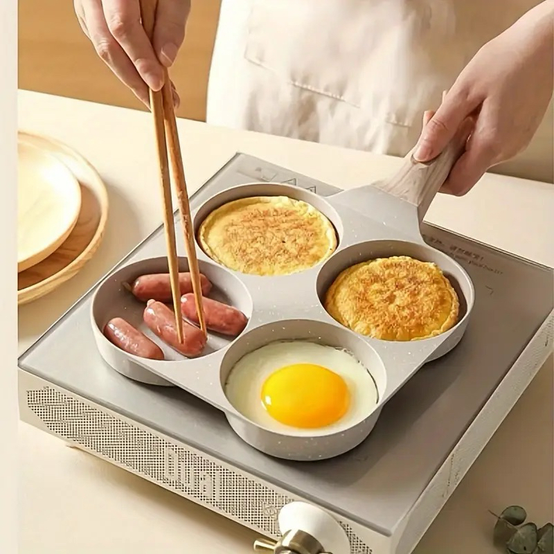 Material Alumínio Características especiais Alça ergonômica, Antiaderente, Compatível com fogão elétrico Cor Preto bege Capacidade 4 Xícaras Dispositivos compatíveis Bobina elétrica, Gás Materiais premium: nossa forma de ovos é feita com alumínio de qualidade superior que fornece e controla rapidamente o calor. Com material 100% seguro, nossa omelete antiaderente garante que seu cozimento diário seja sempre mais seguro e saudável. A alça ergonomicamente projetada tem bom isolamento térmico para proteger você de queimaduras. 【Design atualizado de 4 xícaras】Esta frigideira de ovo pequena usa um design de quatro furos, perfeito para cozinhar omeletes, bacon, hambúrgueres, panquecas, qualquer outra receita diferente que você preferir para servir no seu café da manhã diário. Torna seu cozimento mais rápido e fácil, economizando muito tempo no café da manhã. 【Recurso exclusivo】 Uma tira de silicone de controle de temperatura é fixada em nossa panela de ovo frito que muda de cor quando a temperatura fica alta para que você possa confirmar as etapas de cozimento de acordo com a mudança de cor. A frigideira de ovos vem com uma escova e raspador gratuitos para sua facilidade. 【Fácil de limpar】A panela de café da manhã tem um design plano, nenhuma lacuna deixará comida. É muito fácil de limpar após o cozimento, basta limpar com uma toalha de papel ou enxaguar com água. A alça resistente com orifícios para pendurar facilita o armazenamento. Âmbito de aplicação: a frigideira pequena antiaderente para ovos é adequada para todos os tipos de fogões, é compatível com fogões a gás e fogões de indução. Nossa frigideira de café da manhã aquece mais rápido em comparação com a panela tradicional de ferro fundido. Recomendado para cozinhar em fogo baixo ou médio.