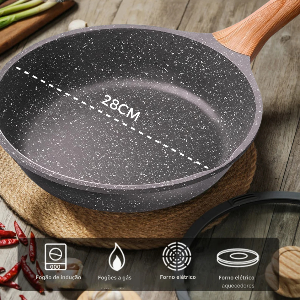 Frigideira Antiaderente Cerâmico Frita Sem Óleo 28cm Funda Cabo Madeira Não Gruda Fogão Indução/Gás