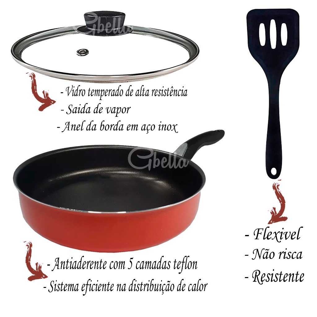 Frigideira Antiaderente Com Tampa de Vidro Alta 18cm Funda Teflon Cor Cereja Gold + Espátula Nylon + Praticidade no seu dia a dia Não gruda Fácil de limpar Principais Características: Durabilidade e Resistência: Fabricado com materiais robustos e duráveis, o cooler é projetado para resistir ao uso constante, garantindo longa vida útil e desempenho consistente mesmo em ambientes externos desafiadores. - Especificações do Produto *Frigideira 18cm Antiaderente, tampa de vidro temperado com Saída de vapor; *Alumínio de alta qualidade, espessura de 1,1 mm, que confere ao item uma estrutura resistente garantindo a durabilidade e distribuição eficiente do calor; *Revestido com 5 camadas de antiaderente TEFLON - PFOA Free, internamente e externamente; *Possui cabo reforçado, feito em baquelite, material antitérmico que não retém calor, para garantir máxima segurança no manuseio; *Revestimento externo: Antiaderente - Cor Cereja; *Revestimento interno: Antiaderente - Cor Dourado/Bege. - Dimensões *Frigideira 18cm de diâmetro - 18cm x 34,5cm x 05,5 cm Capacidade: 1,2 Litro - Recomendações: *Antes do primeiro uso é necessário realizar a limpeza e a cura do item, indispensável para durabilidade e proteção do antiaderente. Lave com esponja macia e detergente neutro, seque-a com um pano limpo. Unte a parte interna com óleo ou outra gordura e leve-a ao fogo baixo por 3 minutos. Deixe-a esfriar, lave, enxugue e está pronta para utilizar; *Utilizar somente espátula de nylon ou silicone para maior durabilidade do Teflon; *Não pode ser levado ao forno e/ou microondas; *Nunca use esponja de aço e objetos metálicos; *Pode ser usada em lava-louças e ir á geladeira. - Itens inclusos *Frigideira 18cm Antiaderente *Tampa de vidro temperado *Espátula Nylon - Garantia de 30 dias contra defeitos de fabricação NCM: 7615.10.00 SKU: PA.250.0009 Conteúdo da embalagem: Frigideira Antiaderente Com Tampa de Vidro Alta 18cm Funda Teflon Cor Cereja Gold + Espátula Nylon