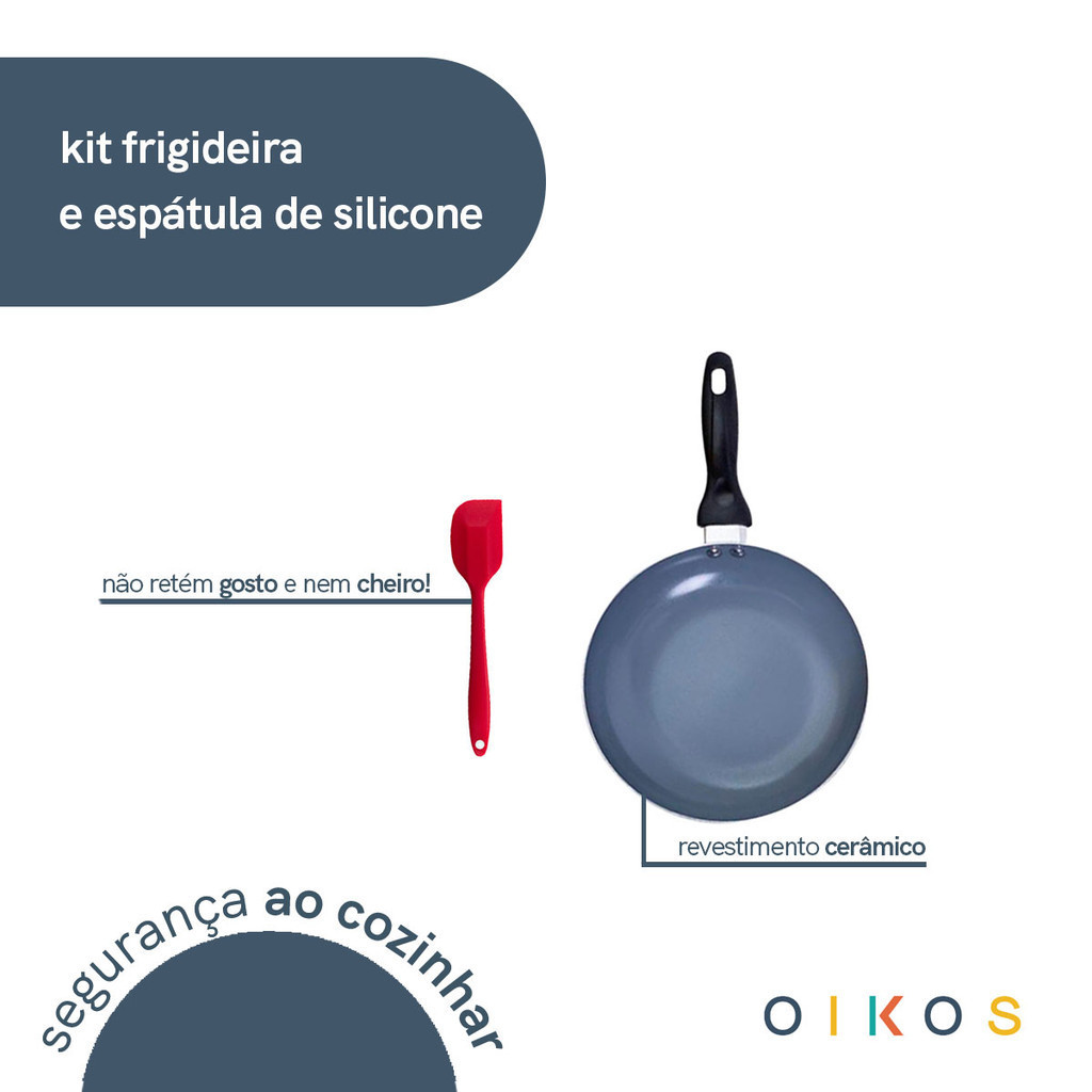 "conheça o kit de frigideira antiaderente cerâmica e espátula de silicone da oikos! antiaderente, com alta qualidade e design funcional, é ótima para fazer suas receitas favoritas sem perigo de grudar alimentos ou ingerir substâncias tóxicas. além disso, possui 5 camadas: antiaderente cerâmico, camada antidesgaste interna, alumínio, camada antidesgaste externa e pintura externa. a espessura é de 2mm: distribui melhor o calor e evita que os alimentos queimem! a frigideira é de alumínio, cerâmica e baquelite. a espátula é de silicone. a frigideira pode ser usada em fogão a gás e fogões elétricos convencionais. não vão em fogão por indução e nem no forno! cuidados com a frigideira: • ao remover as etiquetas, lave com detergente neutro e esponja macia em água morna. seque com um pano suave. • não utilize objetos pontiagudos ou de metal durante o cozimento. • para limpar basta utilizar esponja macia com detergente. • utilize um pouco de água, azeite, óleo ou manteiga antes de aquecer para ajudar na eficiência da antiaderência. • aguarde a frigideira esfriar completamente antes de lavar para evitar choque térmico e deformidades. • preparar alimentos pigmentados pode afetar a cor do revestimento interno. • utilizar sempre em fogo baixo ou médio evita superaquecimentos e deformidades na pintura externa. • a exposição ao fogo fora do espaço delimitado do fundo da frigideira pode causar manchas e desbotamento na pintura externa. • levantar a frigideira em vez de arrastar evita arranhões no fundo. como fazer a cura da frigideira: basta aplicar uma pequena quantidade de óleo vegetal com o auxílio do papel toalha, aquecer em fogo baixo por 1 a 2 minutos e, após esfriar, é só lavar e secar! leve modernidade e praticidade para sua casa! o kit contém: 1 frigideira antiaderente oikos base: 18 cm capacidade: 0,65 L 1 espátula de silicone reta pequena comprimento: 21 cm | largura: 4,2cm | altura: 4cm"