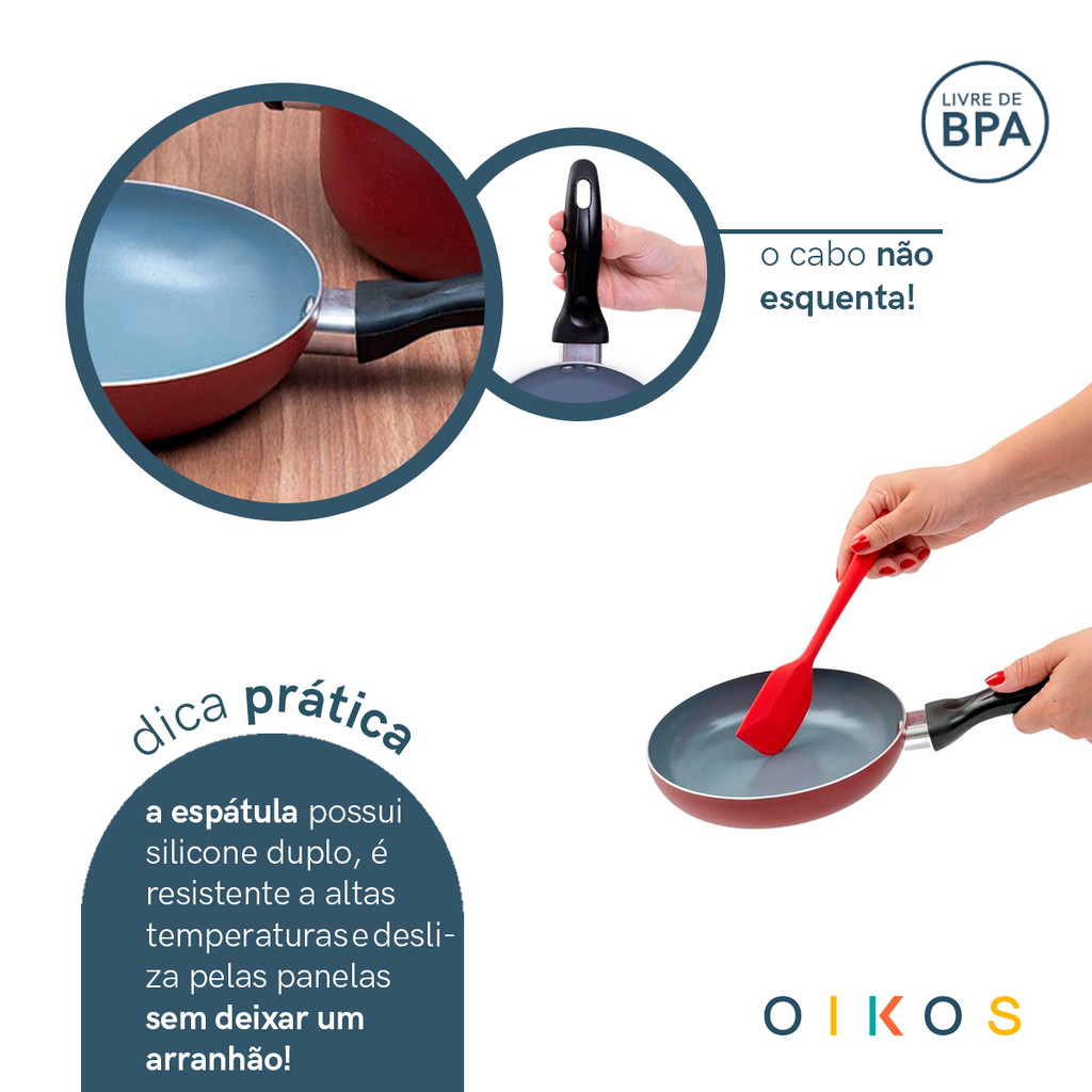 Conheça o kit de frigideira antiaderente e espátula de silicone da Oikos! antiaderente, com alta qualidade e design funcional, a frigideira é ótima para fazer suas receitas favoritas sem perigo de grudar alimentos ou ingerir substâncias tóxicas. além disso, possui 5 camadas: antiaderente cerâmico, camada antidesgaste interna, alumínio, camada antidesgaste externa e pintura externa. a espessura é de 2mm: distribui melhor o calor e evita que os alimentos queimem! a espátula possui silicone duplo e desliza pela frigideira sem deixar 1 arranhão! a frigideira é de alumínio, cerâmica e baquelite. a espátula é de silicone. não utilize objetos pontiagudos ou de metal durante o cozimento. para limpar, basta utilizar esponja macia com detergente. a frigideira funciona em fogão a gás e fogões elétricos convencionais. não vão em fogão por indução e nem no forno! leve modernidade e praticidade para sua casa! o kit contém: 1 frigideira antiaderente oikos base 18 cm - 0,65L 1 espátula de silicone reta pequena comprimento: 21 cm | largura: 4,2cm | altura: 4cm