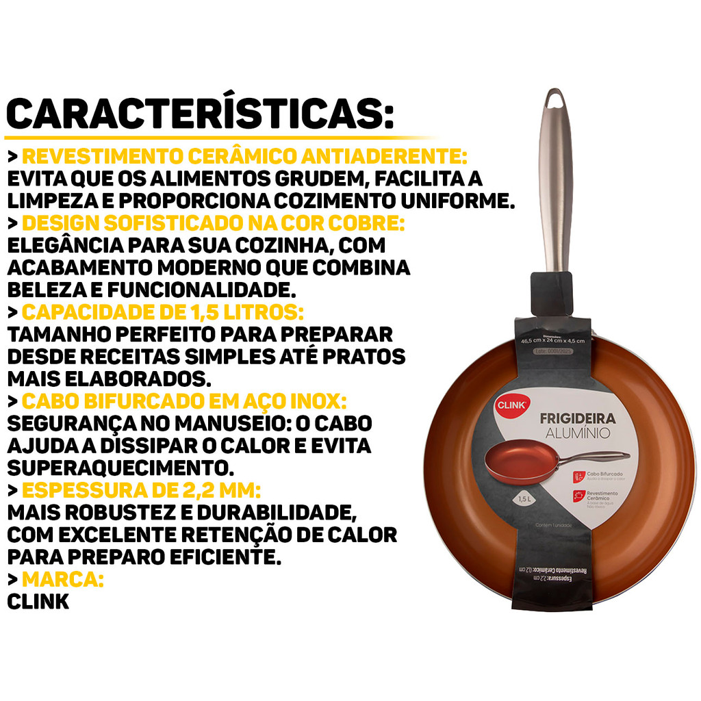 Frigideira Cobre 1,5 Litros Clink A Frigideira da Clink é a escolha ideal para quem procura praticidade e design moderno na cozinha. Possui capacidade de 1,5 litros, e é perfeita para preparar diversos tipos de pratos. É fabricada em alumínio e aço inox, proporcionando excelente distribuição de calor, garantindo que os alimentos cozinhem de forma uniforme e rápida. Características: > Revestimento cerâmico; > Capacidade de 1,5 litros; > Design moderno com acabamento cobre; > Combina com diferentes estilos de cozinhas, trazendo elegância e sofisticação ao ambiente. Especificações Técnicas: > Materiais: alumínio e aço inox; > Dimensões do produto (C x L x A): 46,5cm x 24cm x 4,5cm. - Marca: Clink - Garantia: 90 dias contra defeitos de fabricação Vantagens de comprar na Brester: - Produto a pronta entrega. - Produto novo, com garantia de fábrica. - Nota fiscal para Pessoa Física e Pessoa Jurídica.