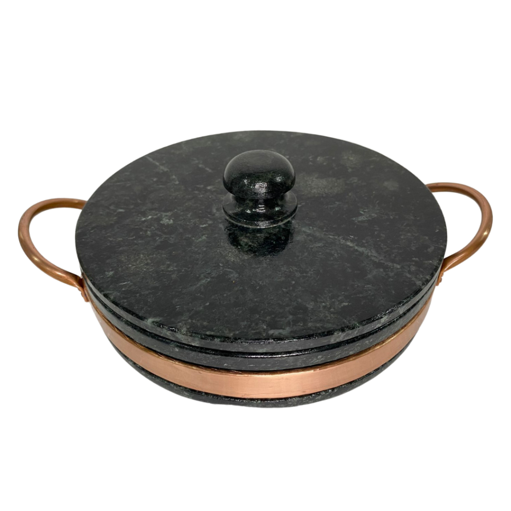 Ideal! Essa é a palavra que define as panelas de pedra sabão, que tem a união do útil ao agradável! Com as frigideiras de pedra sabão ARTE NATIVA, você pode preparar e servir deliciosas comidas, repletas de sabor, e minerais que beneficiam sua saúde, como por exemplo FERRO, CÁLCIO e MANGANÊS. Além de serem charmosas, decorativas e darem muito mais sabor... Elas também mantém tudo quentinho por muito mais tempo. A pedra se manterá quente mesmo após retirar do fogo. Ela se aquece distribuindo o calor de forma uniforme e eficiente. Poderá usar em fogão elétrico, a gás, carvão ou lenha. Não é indicada para fogões de indução. Poderá também combinar com diversos tipos ambientes, e até dar um ar mais sofisticado em sua decoração. A frigideira possui acabamento em cobre, muito durável, bonito e resistente. Acompanha instruções de uso, limpeza e conservação. Medidas das frigideiras: 20cm de diâmetro total. 18cm internos. 4cm de altura. Peso médio 2 kg. * Item artesanal sujeito a variação em relação as medidas e traços em relação as fotos.