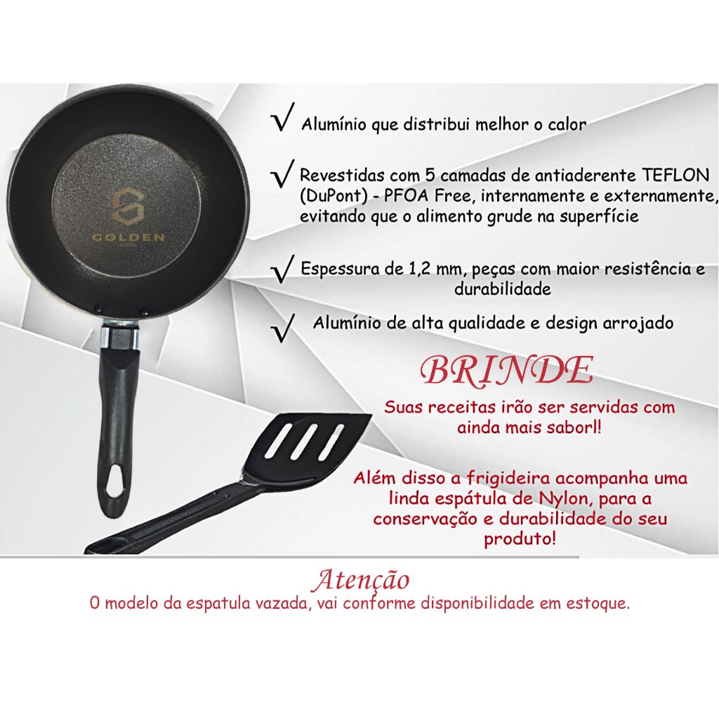 Golden Store O toque de ouro que sua cozinha merece! Frigideira Francesa 16 cm com 5 camadas de Teflon Antiaderente + Espátula Nylon - Especificações do Produto *Frigideira 16 cm Antiaderente; *Alumínio de alta qualidade, espessura de 1,2 mm, que confere ao item uma estrutura resistente garantindo a durabilidade e distribuição eficiente do calor; *Revestido com 5 camadas de antiaderente TEFLON - PFOA Free, internamente e externamente; *Possui cabo reforçado, feito em baquelite, material antitérmico que não retém calor, para garantir máxima segurança no manuseio; *Revestimento externo: Antiaderente - Cor Grafite; *Revestimento interno: Antiaderente - Cor Grafite. - Dimensões aproximadas - cm: (Comprimento x Largura x Altura - Capacidade volume): *Frigideira 16 cm de diâmetro - 28 x 16 x 4 cm – 0,5L - Recomendações: *Antes do primeiro uso é necessário realizar a limpeza e a cura do item, indispensável para durabilidade e proteção do antiaderente. Lave com esponja macia e detergente neutro, seque-a com um pano limpo. Unte a parte interna com óleo ou outra gordura e leve-a ao fogo baixo por 3 minutos. Deixe-a esfriar, lave, enxugue e está pronta para utilizar; *Utilizar somente espátula de nylon ou silicone para maior durabilidade do Teflon; *Não pode ser levado ao forno e/ou microondas; *Nunca use esponja de aço e objetos metálicos; *Pode ser usada em lava-louças e ir á geladeira. - Garantia de 30 dias contra defeitos de fabricação