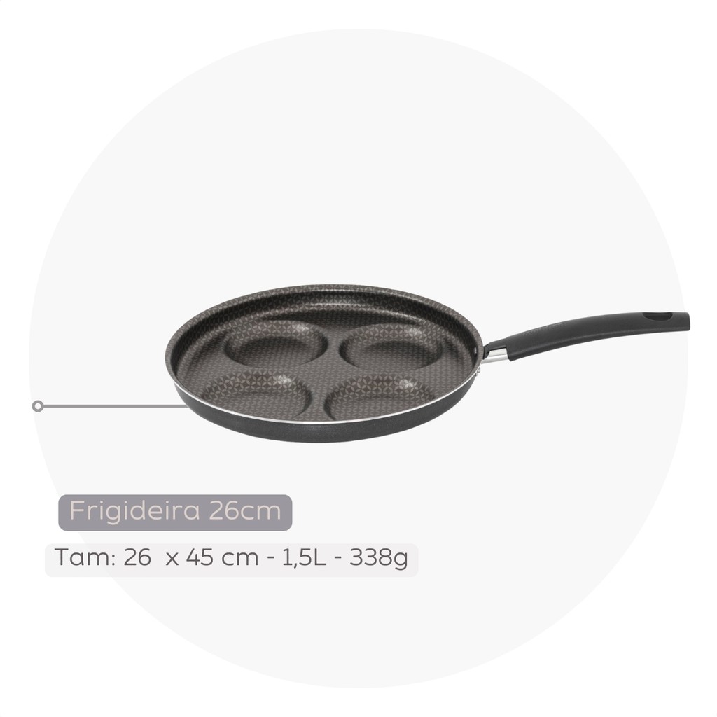 O anúncio contém: 01 Frigideira 4 ovos Perguntas frequentes: Pode ir a lava louças? Sim. Qual o tipo de revestimento? Teflon/esmaltado É de indução? Não. A frigideira ideal para quem busca praticidade, rapidez e organização no preparo das refeições! Com 4 compartimentos independentes, você pode preparar ovos, legumes, carnes e acompanhamentos ao mesmo tempo, sem misturar sabores e sem sujar várias panelas. Seu revestimento exclusivo Ultra7 possui 7 camadas de antiaderente reforçado com partículas de cerâmica, garantindo cozimento uniforme, alimentos que não grudam e uma limpeza super fácil. Além disso, o produto é PFOA FREE, ou seja, livre de substâncias nocivas à saúde. Principais benefícios: - 4 divisórias práticas - Ideal para ovos, hambúrgueres, legumes, etc. - Antiaderente Ultra7 de alta performance - Cozimento uniforme e rápido - Menos louça pra lavar - Cabo ergonômico e resistente ao calor - Compatível com fogões a gás, elétricos e vitrocerâmicos Informações: Dimensões aproximadas da Frigideira 4 ovos (AxLxC): 7cm x 27cm x 45cm. Diâmetro da Frigideira : 20cm. Espessura da Frigideira: 1,4mm Capacidade: 1,5 litros Altura de cada cavidade: 01 cm Cor: Grafite. Material: Alumínio, Baquelite, revestimento teflon. Linha: Gourmet. Fabricante: Multiflon. -Produto novo e em estoque. -As cores do produto podem variar com o lote de fabricação. -Todos os produtos têm seguro contra extravio.