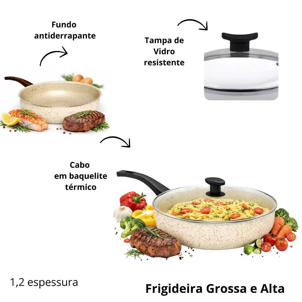 Há uma década, a Be Home define o padrão de confiabilidade no mercado, oferecendo produtos de qualidade com honestidade incomparável. Frigideira Grande Alta Antiaderente Wok Teflon 30 cm com Tampa de Vidro. Descrição A frigideira WOK é uma queridinha da cozinha moderna, ideal para um estilo de vida saudável, pois cozinha rapidamente preservando as propriedades dos ingredientes, como legumes picadinhos. Complete seu jogo de panelas com esse item indispensável. É fabricada no melhor padrão de qualidade, com alumínio 100% puro e aplicação de antiaderente de qualidade máxima para os alimentos não grudarem em sua superfície, evitando o uso exagerado de gordura, tornando a sua comida mais saudável. Possui cabo anatômico que dá mais comodidade, segurança e facilidade durante o manuseio da peça. O fundo usinado faz com que a frigideira não escorregue no fogão, permitindo que o calor se distribua melhor, fritando e grelhando de forma homogênea. Tenha praticidade e durabilidade aliada a um produto de qualidade comprovada. Revestimento: 5 camadas de antiaderente Marca: Be Home Cor: azul Altura: 10 cm Largura: 30 cm Material: alumínio antiaderente Material cabo: baquelite Capacidade: 4,3 litros Peso frigideira sem caixa: 1.4 kg Detalhes: - Pode lavar em Lava-Louças. - Aceita fogão a gás e elétrico. - Revestimento Antiaderente. - Tecnologia antiaderente (5 camadas). - Os alimentos não grudam. - Fácil de limpar. Conselhos na utilização: - Utilize somente utensílios de madeira, nylon ou silicone. -Evite cortar alimentos diretamente na panela. -Não risque a superfície antiaderente. -Não deixe sua panela vazia no fogo. -Evite que a chama incida sobre a lateral da panela. -Deixe sua panela esfriar antes de lavar. -Sempre utilizar fogo brando, fogo alto é desnecessário e pode danificar a panela. Com o tempo de uso, o revestimento antiaderente pode alterar de cor, isto não afeta a performance. Garantia: 7 dias contra defeitos de fabricação. COMPRE AGORA, ÚLTIMAS UNIDADES.