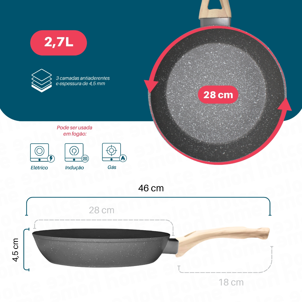 Uma cozinha mais elegante e funcional com as Frigideiras de Indução da Dolce Home! Com as suas 3 camadas de cerâmica e estrutura de alumínio que possui 4mm de espessura proporcionam maior durabilidade e uniformidade térmica sem variações de temperatura durante o cozimento dos alimentos. Elas também mantêm o calor por mais tempo, mantendo a comida quentinha mesmo na mesa de jantar. O cabo em baquelite possui revestimento soft touch, que é super macio ao toque, confortável de segurar e evita queimaduras. A sua base que possui três níveis e pode ser usado em placas a gás, elétricas, vitro-cerâmicas e de indução. Esse sistema de indução funciona por meio de ondas eletromagnéticas, estimuladas pelo fundo da panela. Portanto, uma placa de indução só aquece quando as duas superfícies estão em contato. Com à condução de calor rápida e eficiente do alumínio, o cozimento em baixa ou média temperatura é suficiente, reduzindo o consumo de gás e eletricidade. O revestimento cerâmico não gruda nos alimentos, permitindo que você use menos óleo, mais fácil de limpar e bom para sua saúde. É livre de metais pesados e elementos nocivos à saúde, por isso possui classificação A (Excelente) no Inmetro! Fundo triplo indução, economiza energia e cozinha mais rápido, estrutura de alumínio revestida em cerâmica, vidro temperado com saída para vapor, cabos e alças com revestimento soft-touch super macio ESPECIFICAÇÕES : - Marca: Dolce Home - Conjunto 1 peça - Material: Alumínio com Revestimento antiderente cerâmico e ferritina - Espessura: 4mm - Cor: Cinza Escuro - Cabo com revestimento soft-touch toque super macio - Não vai ao forno, ao micro-ondas e à lava-louças! - Pode ir em Fogões: a Gás, Vitro-cerâmico, Elétrico e Indução Itens e Dimensões: - Frigideira G: 28x4,5 (Cabo 18cm) Capacidade: 2,7L VANTAGENS! - Pode ser usado em todos os tipos de fogões existentes no mercado. Fogão a gás, elétricos, vitro-cerâmicas e de indução. - Possui 3 camadas Antiaderentes e Cerâmica com 4mm de espessura - Seu cabo em baquelite possui revestimento soft touch, que é super macio ao toque, confortável de segurar e evita queimaduras. - O revestimento cerâmico não gruda nos alimentos, permitindo que você use menos óleo - Possui classificação A (Excelente) no Inmetro! - Fundo triplo indução, economiza energia e cozinha mais rápido, estrutura de alumínio revestida em cerâmica. - CUIDADOS ANTES DO PRIMEIRO USO ! Retire os plásticos, etiquetas e adesivos. Lave o produto com água morna e uma esponja macia com sabão neutro ou detergente. Enxágue bem e depois unte a parte interna com óleo ou qualquer outro tipo de gordura. Leve o produto ao fogo baixo até aquecer o conteúdo e deixe esfriar. Descarte o conteúdo e repita a lavagem e secagem para eliminar qualquer resíduo. Pronto, agora o seu produto está disponível para uso. - CUIDADOS APOS DO PRIMEIRO USO! Evite choques térmicos. Sempre deixe o produto esfriar completamente antes de colocar na água. É muito simples manter seu produto limpo e conservado. Basta lavá-lo a mão, com água morna e uma esponja macia, com sabão neutro ou detergente. Em seguida enxágue e seque bem com um pano macio para não danificar. Para remover alimentos queimados, deixe o produto imerso em água por alguns minutos. Se for necessário esfregar, use materiais não abrasivos. NÃO É INDICADO PELO FABRICANTE O USO DE UTENSÍLIOS METÁLICOS, OBJETOS AFIADOS OU PRODUTOS ABRASIVOS. Nossas panelas não contêm metais pesados em sua composição e nem qualquer outro material que possa ser prejudicial à saúde, não tem nem chumbo ou cádmio. Seguimos os padrões mundiais mais altos de exigência em relação a qualidade e segurança à saúde do usuário. 🔒 Certificação Produto certificado conforme regulamentação brasileira. Certificação INMETRO Certificado nº: 12757/2025-PAN-2-1 Fabricado em conformidade com a Portaria INMETRO nº 499/2021, garantindo segurança e qualidade para o consumidor.