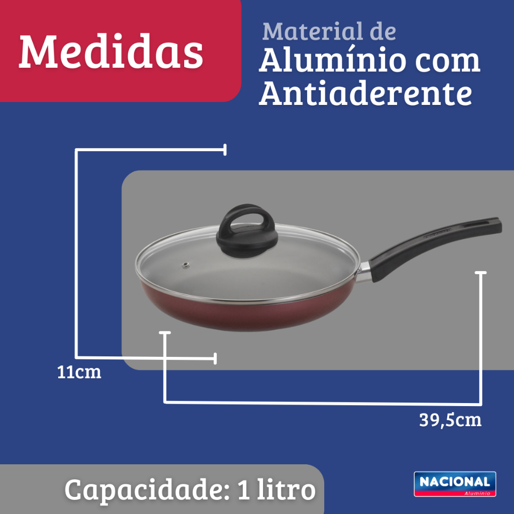 Frigideira Italiana Antiaderente com Tampa de Vidro 24cm A Frigideira Italiana você encontra o melhor quando se trata de fritar, empanar, cozinhar e preparar alimentos, com o diferencial: a tampa pensada especialmente para deixar o ar entrar, que é essencial, ao mesmo tempo que evita respingos de óleo no seu fogão. A versão italiana tem seu diferencial design projetado especialmente para frituras e acabamento antiaderente é o que garante que seu prato saia perfeito. Este utensílio promete facilitar a sua vida, tornando as tarefas da cozinha mais simples e prazerosas para que você possa aproveitar seu dia e sua família. Informações Adicionais: - Corpo Alumínio com revestimento antiaderente Techflon interno e externo. - Os alimentos não grudam. - Fácil de limpar. - Cabo de baquelite antitérmico. Resistentes ao calor, proporcionando maior segurança no manuseio. - Design diferenciado e moderno. Uso Seguro e Adequado: Ao utilizar utensílios quentes, tenha cuidado redobrado. Se necessário, utilize proteção para as mãos e mantenha-os fora do alcance das crianças. Para sua maior segurança, ao utilizar utensílios com cabos, mantenha os sempre voltados para o centro do fogão. Instruções De Uso: Os utensílios com antiaderente Techflon terão maior durabilidade se as instruções abaixo forem seguidas. Antes de Usar: Lave interna e externamente o utensílio, usando apenas uma esponja macia, sabão neutro ou detergente líquido. Enxugue bem com um pano seco e unte as partes internas com óleo ou gordura. Leve ao fogo baixo por um ou dois minutos. Deixe a peça esfriar, lave e enxugue. Durante o Uso: Evite esquentar demais o utensílio vazio. Use o seu utensílio sempre em fogo baixo ou médio para reter o valor nutritivo dos alimentos e conservar o antiaderente. Os utensílios com antiaderente não podem ser aquecidos a temperaturas superiores a 350C. Para mexer ou tirar o alimento, use somente utensílios de nylon ou silicone. Nunca corte alimentos diretamente no revestimento antiaderente. Limpeza: Evite a imersão do utensílio quente em água fria. Deixe o utensílio esfriar antes de lavar. Mesmo depois de vários usos nunca utilize produtos abrasivos na lavagem, como saponáceos ou palhas de aço. Se deixar queimar alimentos, deixe seu produto de molho em água durante algum tempo antes de lavá-lo, assim terá ao produto com o antiaderente sempre conservado. Dimensões Aproximadas; Altura: 4,4 cm Diâmetro: 24 cm Comprimento: 39,5 cm Capacidade: 1,5 Litros