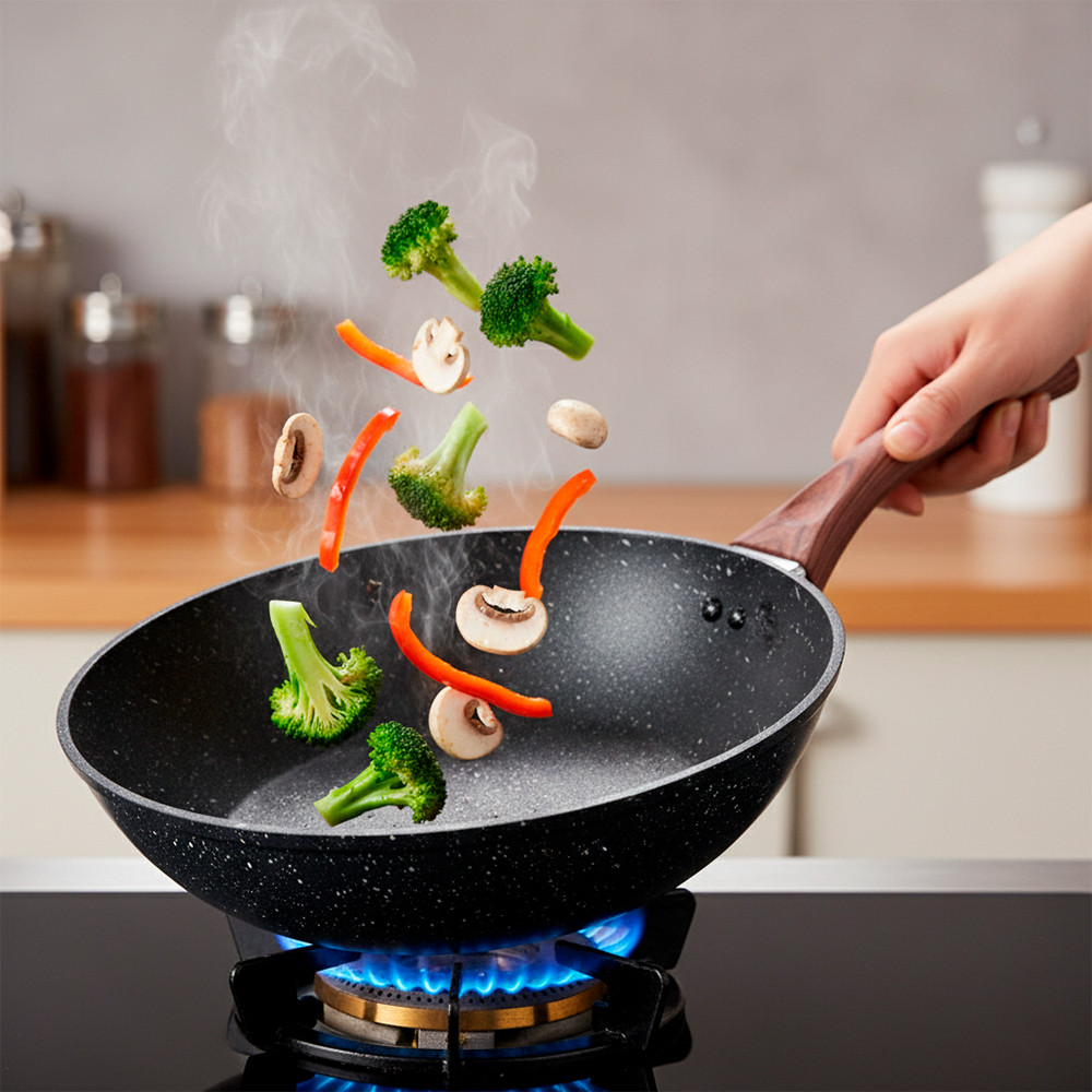 Frigideira Profunda Synmore XJ23-20cm Alumínio Forjado 4.0mm, com 2 Camadas Antiaderentes, Fundo Indução e Cabo Tipo Madeira, Uso Geral 1. Construção Forjada e Espessura 4.0mm: Fabricada em alumínio forjado com uma robusta espessura de 4.0mm, a frigideira Synmore XJ23 garante extrema durabilidade e excelente retenção de calor. Essa construção proporciona alta resistência ao desgaste e uso prolongado. 2. Revestimento Duplo Antiaderente: O interior possui 2 camadas de revestimento antiaderente de alta performance. Esta característica assegura que os alimentos não grudem, facilitando o preparo com menor quantidade de óleo e simplificando a limpeza após o uso. 3. Fundo de Indução e Uso Geral: Equipada com fundo de indução, esta frigideira é perfeitamente adequada para fogões de indução, além de ser compatível para uso geral em fogões a gás. Oferece versatilidade para todos os tipos de cozinha. 4. Cabo Confortável Tipo Madeira: Apresenta um cabo ergonômico com design imitando madeira. O material não aquece, proporcionando uma pegada confortável, segura e firme durante o manuseio dos alimentos quentes. 5. Frigideira Profunda para Versatilidade Culinária: Seu formato profundo é ideal para preparar uma variedade maior de pratos, como ensopados, frituras por imersão, ou grandes quantidades de alimentos salteados. A liga de alumínio garante distribuição de calor eficiente. Garantia 90 dias