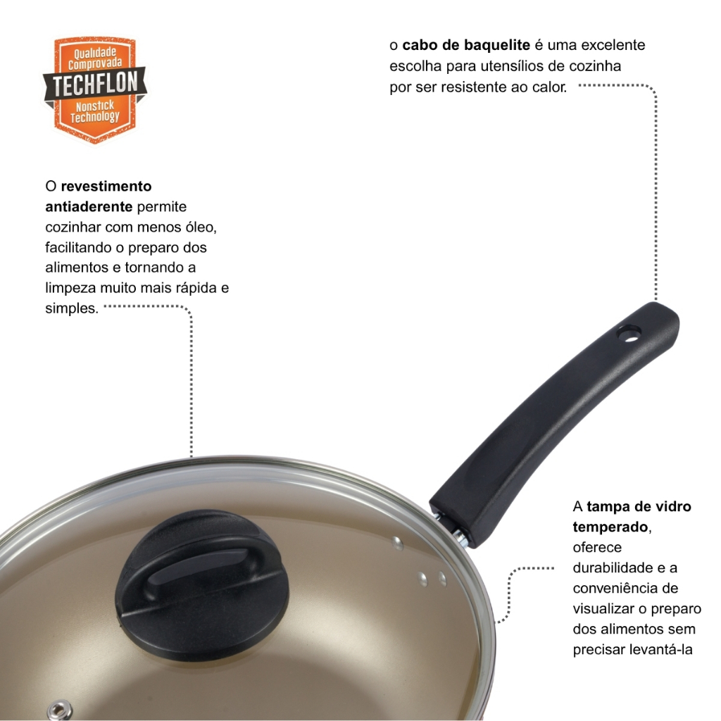 Panela Frigideira Wok 24 c/ Tampa de Vidro Alumínio Nacional As Woks garantem rapidez no preparo graças ao seu formato. Com seu revestimento, proporciona um cozimento muito mais saudável, pois exige baixa utilização de gordura, preservando ainda mais as propriedades nutritivas dos alimentos, ressaltando o sabor de seus pratos. Wok produzida em alumínio com revestimento antiaderente interno e externo, cabo em baquelite antitérmico. Possuir tampa em vidro temperado com saída de vapor e borda de aço inox. Cuidados: Antes de usar pela primeira vez, lave-o com água, detergente e esponja macia. Enxague e seque o produto em seguida unte seu interior com algumas gotas de óleo, leve-a ao fogo baixo por 2 minutos. Deixe esfriar e lave o produto novamente. Não utilize objetos de metal ou pontiagudos. Medidas aproximadas: Diâmetro: 24cm Altura: 16cm Largura com tampa: 26cm Comprimento: 39cm