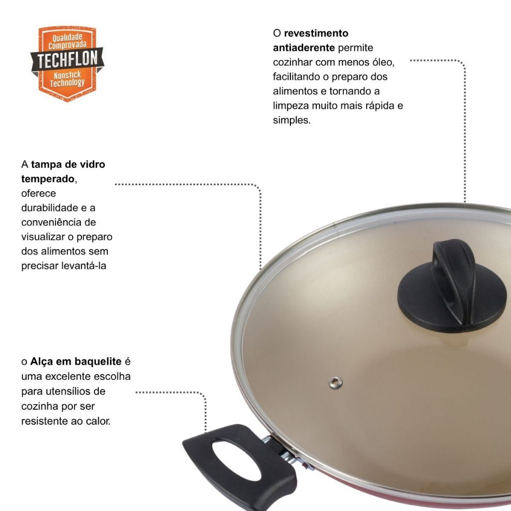 Frigideira Wok Antiaderente Tampa De Vidro 30Cm Cereja