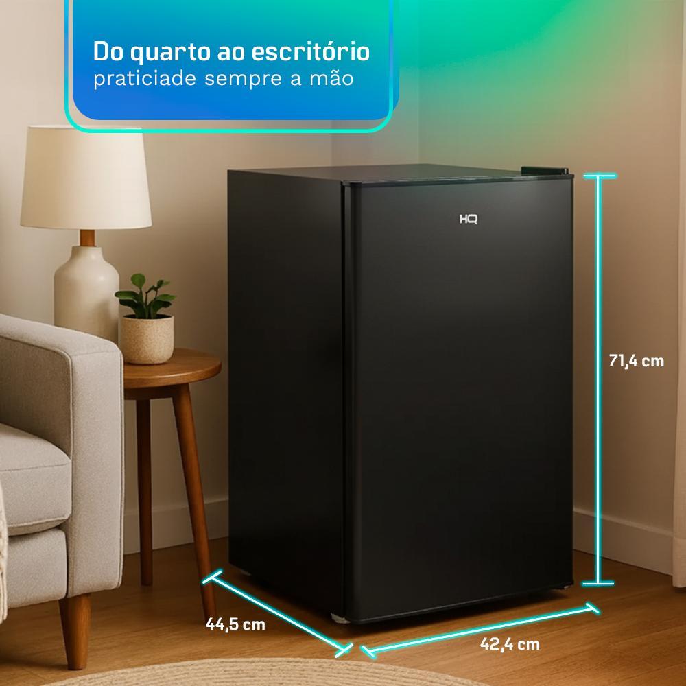 Frigobar HQ 76 Litros Preto BC-76 O Frigobar HQ BC-76 foi pensado para quem precisa de capacidade real sem perder a versatilidade do compacto. São 76 L bem distribuídos, com sala de refrigeração (5 L) para resfriar rapidamente pequenos itens, porta reversível que se adapta ao layout do ambiente e controle de temperatura manual de uso intuitivo. A refrigeração com gás R600a favorece eficiência, enquanto o consumo de 8,13 kWh/mês (ENCE) ajuda a manter os custos previsíveis. A instalação é simples: recomenda-se 10 cm de ventilação ao redor, e a manutenção é prática graças ao degelo manual. O formato estreito (42,4 cm de largura) e a altura de 71,4 cm facilitam encaixar em nichos e bancadas enxutas, sem abrir mão do espaço interno. Por que isso importa na rotina? - Mais espaço no compacto: 76 L para bebidas, lanches e recipientes pequenos. - Instalação versátil: porta reversível facilita posicionar do lado que o ambiente pede. - Previsibilidade de custos: 8,13 kWh/mês (ENCE). - Formato estreito: 71,4 × 42,4 × 44,5 cm (L×P×A) otimiza nichos e bancadas. Destaques técnicos e funcionais - Controle de temperatura: manual (ajuste direto no termostato). - Tipo de degelo: manual (com bandeja coletora). - Organização interna: prateleira removível, nichos na porta, puxador embutido; pés frontais ajustáveis; sala de refrigeração (5 L). Cenários de uso - Quarto / home office: apoio silencioso e sempre à mão. - Escritório / recepção / consultório: praticidade e agilidade no atendimento. - Hotelaria: solução compacta para suítes e áreas de apoio. Orientações de uso - Ajuste a temperatura conforme a necessidade (controle manual). - Não obstruir saídas de ar e manter folgas de ventilação (recomendado 10 cm ao redor). - Produto com versões 127 V ou 220 V — NÃO é bivolt (evitar adaptadores/“T”). - Uso interno em ambiente ventilado, nivelado e seco. Facilidade de limpeza - Desligar antes de limpar; pano macio levemente umedecido; sem solventes/abrasivos. - Degelo manual: esvazie, gire o seletor para “0”, aguarde o gelo derreter e recoloque os itens após estabilizar. Segurança - R600a (inflamável): não perfurar tubulação; evitar fontes de ignição. - Elétrica (NBR 5410): tomada aterrada e circuito adequado; não usar adaptadores/benjamins. - Em dano ao cabo, acionar assistência autorizada. Sustentabilidade - ENCE 8,13 kWh/mês; uso de R600a e ciclopentano. - Descarte ambientalmente correto ao fim da vida útil (logística reversa/local). Itens na embalagem Frigobar 76 L Manual de instruções Certificado de garantia Acessórios internos (conforme diagrama) Especificações Técnicas Marca:HQ Modelo: BC-76 Cor: Preto Capacidade Total: 76 L (inclui sala de refrigeração 5 L) Classificação Energética: A+++ Voltagem: 127 V ou 220 V (Não é Bivolt) Frequência: 60 Hz Controle de temperatura: manual Tipo de degelo: manual Refrigerante: R600a Agente de expansão: Ciclopentano Consumo de energia (ENCE): 8,13 kWh/mês Instalação: manter 10 cm de ventilação nas laterais, topo e fundo (uso interno) Dimensões e Peso do Produto Altura: 71,4 cm Largura: 42,4 cm Profundidade: 44,5 cm Peso (líq.): 13 kg Garantia 01 Ano (Sendo 3 meses de garantia legal e mais 9 meses de garantia para defeito de fabricação).