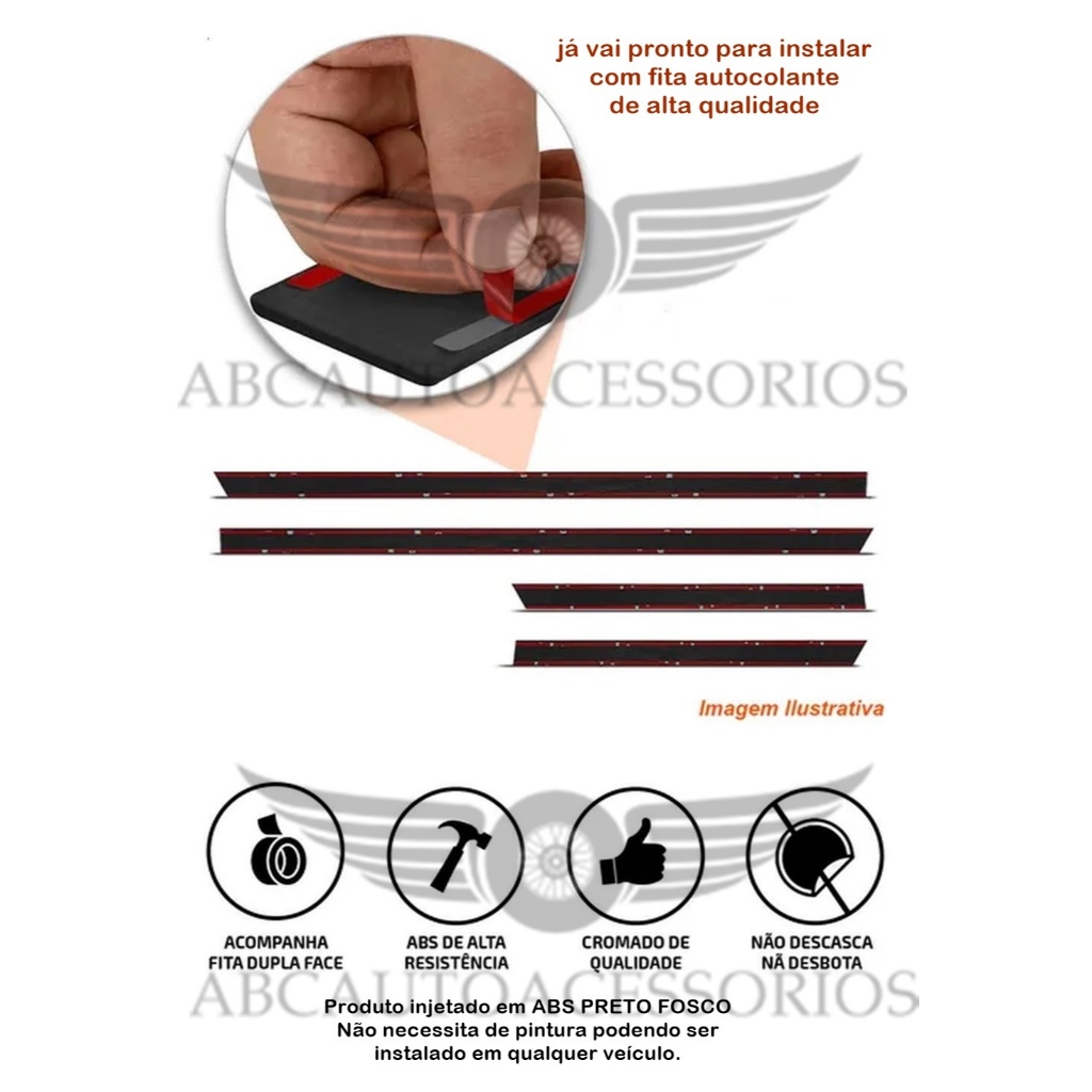 Descrição do produto Jogo de Friso Lateral para proteção contra pequenos impactos: Você pode ter mais tranquilidade ao abrir as portas do seu veículo em estacionamentos de mercados e condomínios, utilizando nossos frisos para seu Carro. Ele tem a função de proteger a lateral do seu carro de pequenas colisões como batidas em paredes ou em outros carros. Especificação Técnica: • Kit Jogo de Frisos Tipo Borrachão • Produzido em Plástico ABS de Alta Resistência • Disponível na Cor Preta Fosco • Melhora a Estética e Protege a Lateral do Carro • Possui Grafia IMPRESSA • Fixação Prática por Fitas Dupla-Face Inclusas • Superfície Fácil de Limpar• Acomodação Perfeita no Veículo • Design esportivo • Na medida certa para o veículo • Modelo sem furos • Fixação por fita adesiva de alta resistência • Alta resistência a impacto • Abrilhanta o aspecto externo do veículo • Fácil Instalação ITENS INCLUSOS: Jogo completo contendo 4 Frisos Laterais em Abs com o nome do carro exatamente como na foto. • 1 Jogo de Friso Lateral com 4 peças • 2 peças dianteiras • 2 peças traseiras FIXAÇÃO:Possui sistema de fixação por Dupla Face adesiva automotiva especia. Atualmente é o que há de mais seguro no mercado. COMPATIBILIDADE: Todos os modelos de veículos anunciados da marca e ano. GARANTIA: Garantia de 3 meses para DEFEITOS DE FABRICAÇÃO.OBSERVAÇÕES: • Valor do Jogo • Imagens meramente ilustrativas • Para melhor instalação, aplique sobre a superfície limpa e seca. Não molhe o local aplicado durante 24 horas. • Recomendamos que a instalação seja realizada por Profissionais• Não nos responsabilizamos por instalação, manuseio indevido ou uso incorreto do Produto.