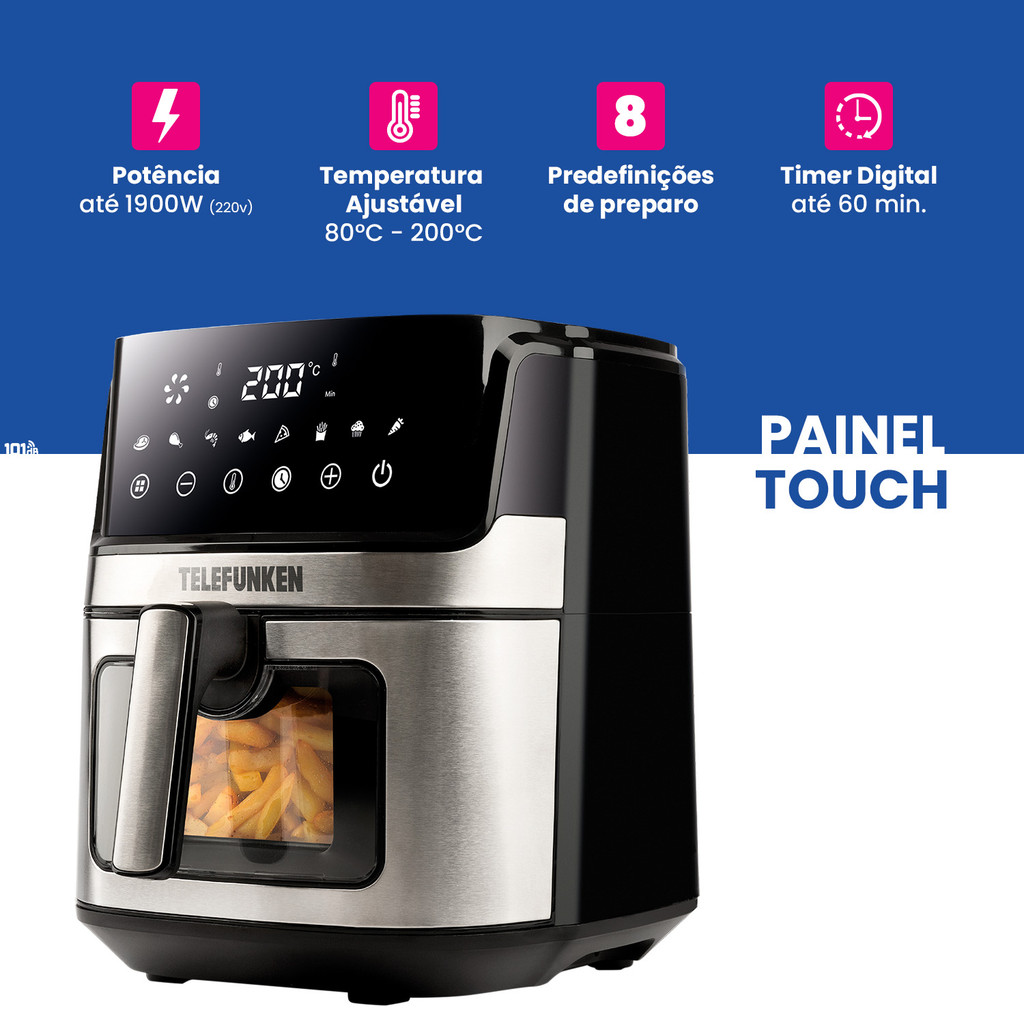 Desfrute de uma Alimentação Saudável com a Fritadeira Air Fryer Digital 6,9 litros Telefunken Easy Fryer 6900 Descubra a maneira mais fácil e prática de preparar alimentos saudáveis para toda a família com a Easy Fryer 6900. Seu display digital e painel touch intuitivo facilitam o controle das 8 funções pré-estabelecidas, tornando a experiência culinária ainda mais simples e prazerosa. Capacidade excepcional Com 6,9 litros de capacidade, esta fritadeira air fryer é perfeita para atender todos os tipos de receitas. A circulação de ar em 360° garante que seus pratos sejam fritos com ar quente de forma uniforme, resultando em uma textura crocante e deliciosa, sem excesso ou nenhum óleo. A janela frontal permite visualizar o alimento em todo o processo de preparo, sem a necessidade de abrir a air fryer, mantendo o calor interno, reduzindo o tempo de preparo e preservando o sabor e a textura dos alimentos. O timer de até 60 minutos permite ajustar o tempo de cozimento conforme necessário, garantindo que suas refeições estejam prontas na hora certa para toda a família aproveitar. Além disso, o engate rápido SafeLock facilita ainda mais o manuseio da fritadeira, tornando o processo de cozimento fácil e seguro. Potência de SobraCom uma potência impressionante de até 1900W, esta fritadeira elétrica air fryer é uma das mais potentes do mercado, capaz de fritar os alimentos com ar quente de maneira rápida e eficiente, mantendo seu sabor e crocância, sem comprometer a sua saúde. Principais Características Fritadeira Air Fryer Digital 6,9L Telefunken Easy Fryer 6900 Painel touch e digital Cesto removível Iluminação interna Controlador digital de temperatura Controlador digital de tempo - (0 - 60 min) Circulação de ar 360° Possui temperatura ajustável entre 80 °c e 200 °c Alça resistente a altas temperaturas. Potência: 1700W (127V) | 1700W - 1900W (220V) Sistema de segurança SafeLock Superfície antiaderente 8 Funções pré-estabelecidas Frita, assa, gratina e descongela Medidas do produto: 36,8x28,8x32,2cm Comprimento do cabo: 1 metro Medidas da caixa: 36,8x28,8x32,2cm Pesa: 5,5 kg Alimentação elétrica: 127-240V~; 50-60Hz; Classe I Adquira agora mesmo a sua Fritadeira Air Fryer Digital 6,9 litros Telefunken Easy Fryer 6900 e transforme a alimentação de toda familía de forma prática e saudável.
