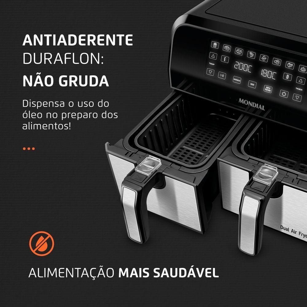 Fritadeira Air Fryer Dual Duplo Cesto 8l Mondial Afd-01-bi Air Fryer Afd-01-bi 127v/60hz<br>A família Air Fryer cresceu e uma delas, com certeza, é do tamanho da sua família e perfeita para você! A Mondial apresenta a Dual Air Fryer: com o duplo cesto e a tecnologia DualZone, você prepara duas receitas ao mesmo tempo, com temperaturas e tempos diferentes em cada cesto. Incrível, né? Já a exclusiva função Sincronizar permite programar tempos diferentes em cada preparo e, ainda assim, os pratos ficam prontos juntos. Saiba mais sobre a AFD-01-BI:TECNOLOGIA DUALZONE: 2 RECEITAS AO MESMO TEMPOCom o duplo cesto e a tecnologia DualZone, você prepara 2 receitas simultaneamente, com TEMPOS e TEMPERATURAS diferentes em cada cesto. Incrível, né? FUNÇÃO SINCRONIZARVocê pode programar cada cesto com um tempo diferente e, quando o aviso sonoro apitar, as receitas estarão prontas AO MESMO TEMPO.EXCLUSIVO DUPLO CESTO REMOVÍVELA Dual Air Fryer possui 2 cestos removíveis e capacidade total de 8 litros. É mais fácil de usar e limpar, além de proporcionar maior praticidade na hora de retirar os alimentos.TECNOLOGIA DE CIRCULAÇÃO DE AR QUENTEO sistema da Air Fryer aquece e circula o ar. O ar superquente envolve e cozinha o alimento, sem a necessidade de usar óleo.ALIMENTAÇÃO MAIS SAUDÁVELPor não precisar de óleo no preparo das receitas, a Fritadeira a Ar permite uma rotina alimentar com mais sabor e saúde. ANTIADERENTE DURAFLON: NÃO GRUDAOs cestos possuem antiaderente Duraflon, tecnologia exclusiva Mondial, e os alimentos não grudam no fundo.FACILIDADE NA LIMPEZAEvite um ambiente engordurado, com fumaça e cheiro de fritura. Além disso, a limpeza da parte interna é fácil, pois os cestos e as cubas são removíveis e antiaderentes.PAINEL DIGITAL COM 11 FUNÇÕES PRÉ-PROGRAMADASPrepare receitas com apenas 1 clique! As funções pré-definidas são: batata, carne, peixe, camarão, frango, pão de queijo, legumes, bolo, preparo duplo, virar e sincronizar.CROCÂNCIA? TEMOS!Para quem se pergunta se a receita na Fritadeira Sem Óleo fica com textura semelhante à produzida em fogão ou forno tradicional, a resposta é: Sim! A comida na Air Fryer fica suculenta por dentro e dourada e crocante por fora.CONTROLE DE TEMPERATURA: ATÉ 200°CPermite a escolha da temperatura ideal para diferentes tipos de alimentos.TIMER DE 60 MINUTOSFacilidade e comodidade de selecionar o tempo necessário de preparo das receitas. Aproveite o tempo enquanto a Air Fryer trabalha para você!AVISO SONORO + DESLIGAMENTO AUTOMÁTICOApós o tempo pré-definido no Timer, há um aviso sonoro e a Fritadeira desliga automaticamente.UM ANO DE GARANTIA MONDIALA Mondial é a escolha de milhões de consumidores. Mondial, a escolha inteligente!<br>Modelo - AFD-01-BI<br>Cor - Preta/Inox<br>Voltagem (Tensão) - 127V/220V<br>Itens inclusos - 01 Fritadeira; 01 Livro de Receitas e 01 Manual de Instruções<br>Capacidade - 8 litros<br>Potência - 2000W<br>Temperatura - Até 200ºC<br>Timer - 60 minutos<br>Ação do produto - Assar, cozinhar, gratinar e fritar seus alimentos<br>Tipo de alimentos que comporta - Prepara petiscos, massas, carnes, pastéis, pão de queijo, churros, peixes entre outros<br>Revestimento antiaderente - Sim<br>Segurança - Aviso sonoro e desligamento automático<br>Tipo de fritadeira - Fritadeira Elétrica<br>Luz indicadora - Sim<br>Dimensões do produto - 30,7cm x 37,8cm x 38,2cm (AxLxP)<br>Peso do produto - 7kg<br>Tipo de tomada (amperes) - 20A<br>Garantia - 12 meses