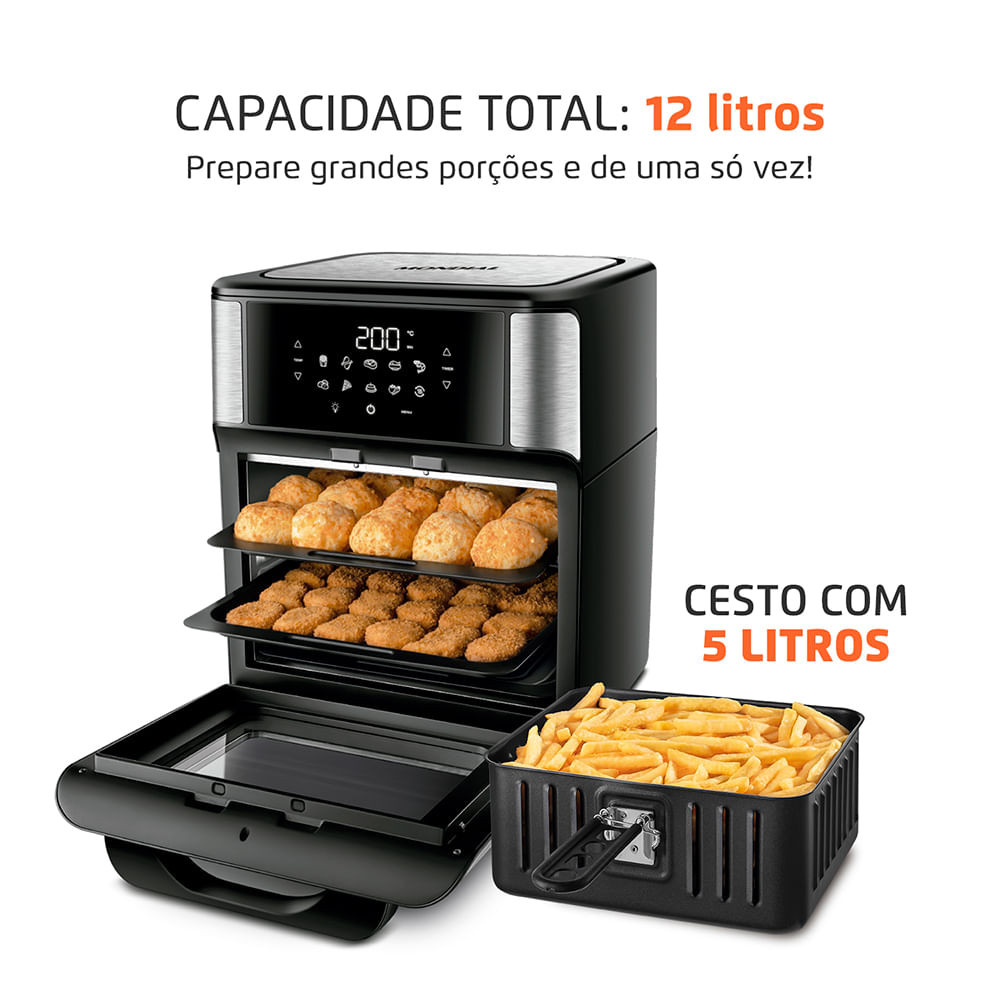A Air Fryer AFO-12L-BI da Mondial é 2 em 1: Fritadeira a Ar com o espaço e versatilidade do forno. Você pode assar, cozinhar e fritar sem óleo e produzir receitas muito mais saudáveis! A capacidade total de 12 litros permite o preparo de grandes porções e de uma só vez. Saiba mais sobre a AFO-12L-BI: 2 EM 1: AIR FRYER + FORNO: A família de Air Fryers Mondial continua crescendo! O modelo OVEN alia as vantagens da tecnologia da Air Fryer ao espaço e versatilidade do forno. Você pode assar, cozinhar e fritar sem óleo e com perfeição. CAPACIDADE TOTAL: 12 LITROS: Prepare grandes porções e de uma só vez. São 12 litros de capacidade: a Air Fryer Oven da Mondial é uma gigante na categoria! PORTA COM AMPLO VISOR + ILUMINAÇÃO INTERNA: Praticidade para visualizar as receitas durante o preparo. CESTO DE 5 LITROS + 2 EXCLUSIVAS ASSADEIRAS: Você tem a opção de usar as duas exclusivas assadeiras com antiaderente, que são resistentes e fáceis de usar e limpar. As assadeiras são ideias para pão de queijo, nuggets, pizza, entre outros. Já o cesto, com capacidade de 5 litros, é indicado para preparar assados, batata frita, bolo e muito mais! PAINEL DIGITAL COM 10 FUNÇÕES PRÉ-DEFINIDAS: Prepare receitas com apenas 1 clique! As funções pré-definidas são: Batata, frango, carne, peixe, camarão, pão de queijo, pizza, bolo, legumes e a função reaquecer. TECNOLOGIA DE CIRCULAÇÃO DE AR QUENTE: A Air Fryer é equipada com uma tecnologia que aquece e circula o ar. O ar superquente envolve e cozinha o alimento, sem a necessidade de usar óleo. ANTIADERENTE DURAFLON: NÃO GRUDA: O cesto e as assadeiras possuem o antiaderente Duraflon, tecnologia exclusiva Mondial, e os alimentos não grudam no fundo. ALIMENTAÇÃO MAIS SAUDÁVEL: Por não precisar de óleo no preparo das receitas, a Air Fryer permite uma rotina alimentar com mais sabor e saúde. PRATICIDADE E RAPIDEZ NA COZINHA: A Tecnologia de Circulação de Ar Quente e a alta potência de 2000W possibilitam rapidez no preparo das receitas. Aliado a isso, a função Timer de 90 minutos proporciona a liberdade para você se dedicar a outras tarefas enquanto a Air Fryer trabalha para você. FACILIDADE NA LIMPEZA: Já imaginou fazer uma fritura sem deixar a cozinha completamente suja? A Fritadeira Elétrica te proporciona isso: evita um ambiente engordurado, fumaça e cheiro de fritura. Além disso, a limpeza da parte interna é fácil, pois o cesto e as assadeiras são removíveis e antiaderentes. MUITO MAIS QUE BATATA FRITA: INVISTA EM MAIS RECEITAS: A Air Fryer é versátil e permite que você prepare pratos que vão muito além da clássica batata frita. É possível preparar legumes, carnes, peixes, lasanha, pizzas, além de pratos doces, como pudim, bolo de chocolate e cookies. Use sua criatividade e mãos à obra! UM ANO DE GARANTIA MONDIAL: A Mondial é a escolha de milhões de consumidores. Mondial, a escolha inteligente!