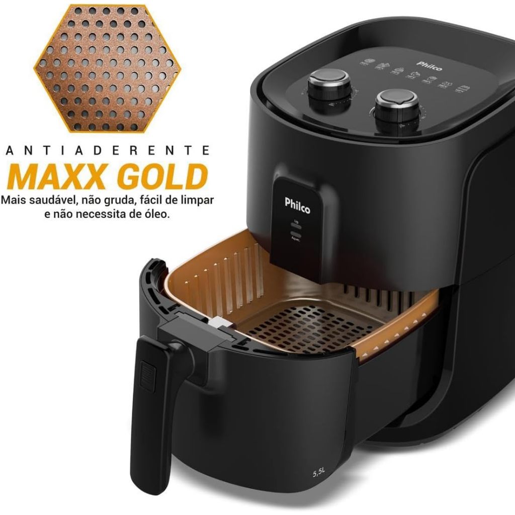 Fritadeira Elétrica Air Fryer Philco PAF55A 5,5 L 1500W – Mais Saúde, Sabor e Praticidade na Sua Cozinha A Air Fryer Philco PAF55A 5,5 Litros é perfeita para quem deseja preparar alimentos saborosos, crocantes e muito mais saudáveis, sem usar óleo. Com capacidade para 5,5 litros, ela é ideal para famílias que buscam praticidade no dia a dia, preparando porções generosas de batatas, carnes, legumes, empanados e até bolos. Com potência de 1500W e controle de temperatura ajustável até 200°C, a PAF55A garante um cozimento rápido e uniforme. O timer de até 60 minutos com desligamento automático proporciona segurança e evita que os alimentos passem do ponto. Seu cesto com revestimento antiaderente facilita a limpeza e evita que os alimentos grudem. O design moderno com acabamento preto fosco e detalhes em inox combina com qualquer cozinha. A fritadeira ainda conta com base antiderrapante e luz indicadora de funcionamento e aquecimento, garantindo segurança e facilidade no uso. Principais Benefícios Capacidade de 5,5L: ideal para toda a família Potência de 1500W para preparo rápido e eficiente Dispensa o uso de óleo, proporcionando receitas mais saudáveis Controle de temperatura ajustável de 80°C a 200°C Timer de 60 minutos com desligamento automático Cesto com revestimento antiaderente: fácil de limpar Design moderno e compacto com acabamento em preto e inox Base antiderrapante e luzes indicadoras de funcionamento Ficha Técnica: Marca: Philco Modelo: PAF55A Tipo Fritadeira elétrica Air Fryer Capacidade: 5,5 Litros Potência: 1500W Voltagem: 110V ou 220V Controle de temperatura: 80°C a 200°C Timer: Até 60 minutos com desligamento automático Cesto: Removível com revestimento antiaderente Material/Acabamento: Plástico com detalhes em inox Luzes indicadoras: Funcionamento e aquecimento Base: Antiderrapante Dimensões: (AxLxP) 36 x 28 x 34 cm Peso: 4,5 kg Itens Inclusos: 1x Fritadeira Elétrica Philco Air Fryer PAF55A ; 1x Cesto removível com antiaderente; 1x Manual do usuário; 1x Guia rápido de uso.