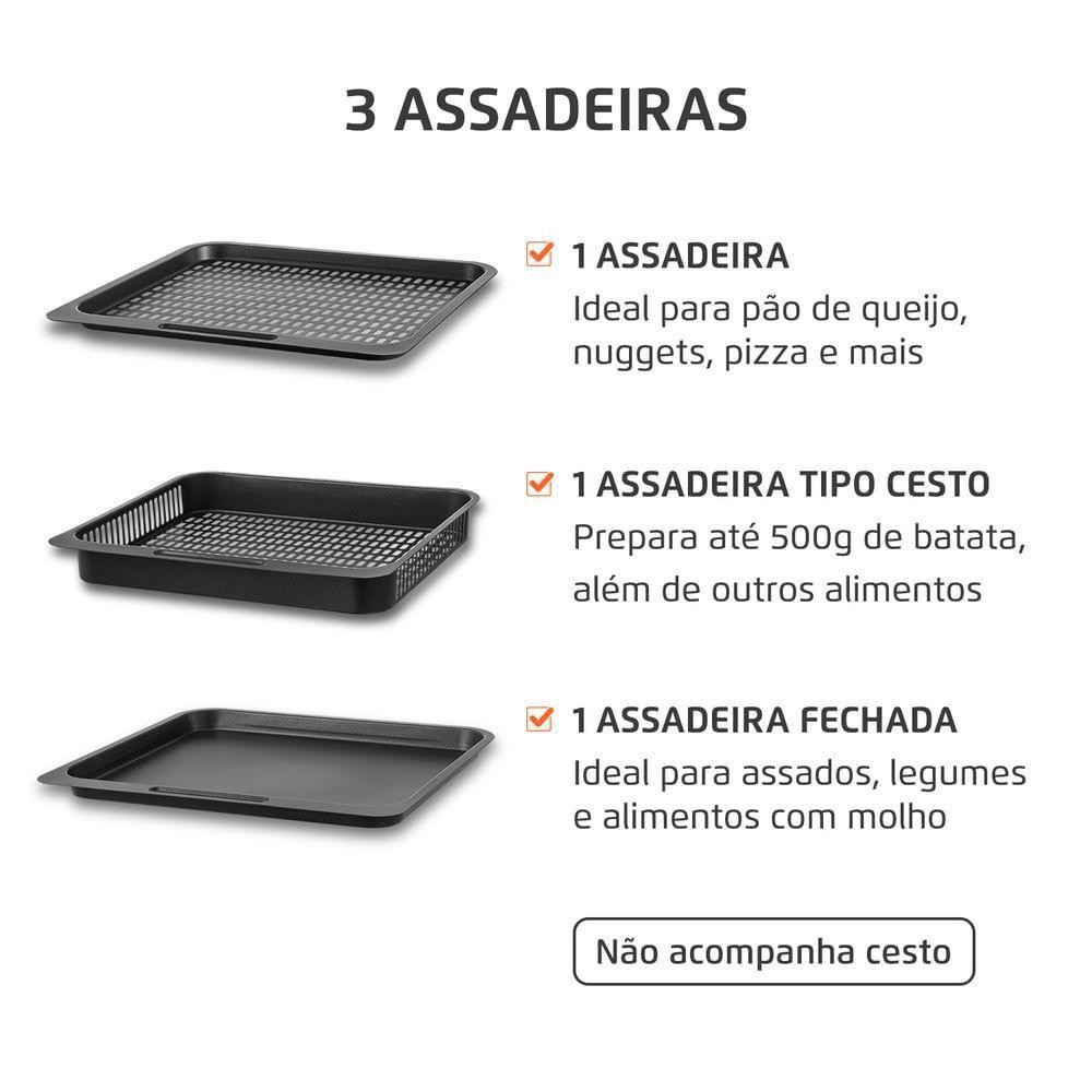 Fritadeira Elétrica Forno Oven 12L Mondial AFON-12L-BI-BC - 110V A Air Fryer Forno da Mondial é 2 em 1: fritadeira a ar com o espaço e a versatilidade do forno. Você pode assar, cozinhar e fritar sem óleo e produzir receitas muito mais saudáveis! A capacidade total de 12 litros permite o preparo de grandes porções de uma só vez. Além disso, a Air Fryer vem com 3 assadeiras: A assadeira tipo cesto é perfeita, pois possui capacidade para preparar até 500g de batata frita. A assadeira fechada é ótima para fazer legumes e alimentos com molhos. Destaques do Produto: - 2 em 1 - Air Fryer + Forno A família de Air Fryers Mondial continua crescendo! O modelo OVEN une as vantagens da tecnologia da Air Fryer ao espaço e versatilidade do forno. Você pode assar, cozinhar e fritar sem óleo e com perfeição. - Design Sofisticado e “Tech” A robustez e o design refinado da OVEN da Mondial, aliados ao painel digital, são atributos que garantem sofisticação e tecnologia ao ambiente. É um item deslumbrante para a sua cozinha, não é mesmo? - Capacidade Total de 12 Litros Prepare grandes porções e de uma só vez. São 12 litros de capacidade: a Air Fryer Forno da Mondial é uma gigante na categoria! - 3 Assadeiras Antiaderentes A AFON-12L-BI-BC vem com 3 assadeiras antiaderentes, resistentes e fáceis de limpar: Assadeira tipo cesto: prepara até 500g de batata frita e outros alimentos. Assadeira aberta: ideal para pão de queijo, nuggets, peixes, carnes e mais. Assadeira fechada: perfeita para legumes e alimentos com molhos. - Prepare até 3 receitas de uma vez Com as 3 assadeiras dispostas em prateleiras, a OVEN é multifuncional e permite o preparo de até 3 receitas ao mesmo tempo. Dica: A primeira prateleira (mais alta) tem cozimento mais rápido. Sincronize as assadeiras conforme a altura e o tipo de preparo. - Painel Digital com 10 Funções Predefinidas Prepare receitas com apenas 1 clique! Funções: batata, frango, carne, peixe, camarão, pão de queijo, pizza, bolo, legumes e reaquecer. - Tecnologia de Circulação de Ar Quente A tecnologia aquece e circula o ar de forma uniforme. O ar superquente envolve e cozinha o alimento, dispensando o uso de óleo. - Porta com Amplo Visor + Iluminação Interna Praticidade para visualizar suas receitas durante o preparo. - Antiaderente Duraflon As assadeiras possuem o revestimento Duraflon – os alimentos não grudam no fundo. - Alimentação Mais Saudável Sem uso de óleo, suas receitas ficam mais leves, saborosas e saudáveis. - Mais Econômica Graças ao termostato eficiente, a Air Fryer consome menos energia. Cozinha econômica e inteligente! - Praticidade e Rapidez na Cozinha Alta potência + circulação de ar quente = preparo rápido! O timer de 90 minutos te dá liberdade para outras tarefas. - Facilidade na Limpeza Fritura sem sujeira! Sem fumaça, sem cheiro e sem gordura espalhada. Assadeiras removíveis e antiaderentes facilitam a higienização. - Muito Mais que Batata Frita Prepare receitas : Salgadas: legumes, picanha, parmegiana, rocambole vegetariano, carnes e peixes Doces: tortinhas de banana, cheesecake, pudim e cookies Use sua criatividade! - Acompanha Luva de Silicone Mais no manuseio das assadeiras e alimentos. - Um Ano de Garantia Mondial A Mondial é a escolha de milhões de consumidores. Mondial, a escolha inteligente! Especificações Técnicas: Modelo: AFON-12L-BI-BC Cor: Preto/Inox Voltagem (Tensão): 110V Itens Inclusos: 01 Fritadeira, 02 Assadeiras, 01 Assadeira Coletora, 01 Luva de Silicone, 01 Livro de Receitas, 01 Manual de Instruções Capacidade: 12L Potência: 2000W Temperatura: Até 200ºC Timer: 90 minutos Ação do Produto: Assar, cozinhar, gratinar e fritar Alimentos compatíveis: Batata, frango, carne, peixe, camarão, pão de queijo, pizza, bolo, legumes e função reaquecer Revestimento Antiaderente: Sim : Aviso sonoro e desligamento automático Tipo de Fritadeira: Fritadeira Elétrica Luz Indicadora: Sim Peso: 7,620kg Tipo de Tomada (amperes): 20A Dimensões do Produto: 39cm x 32cm x 36,1cm (AxLxP) Marca: Mondial Garantia: 12 meses