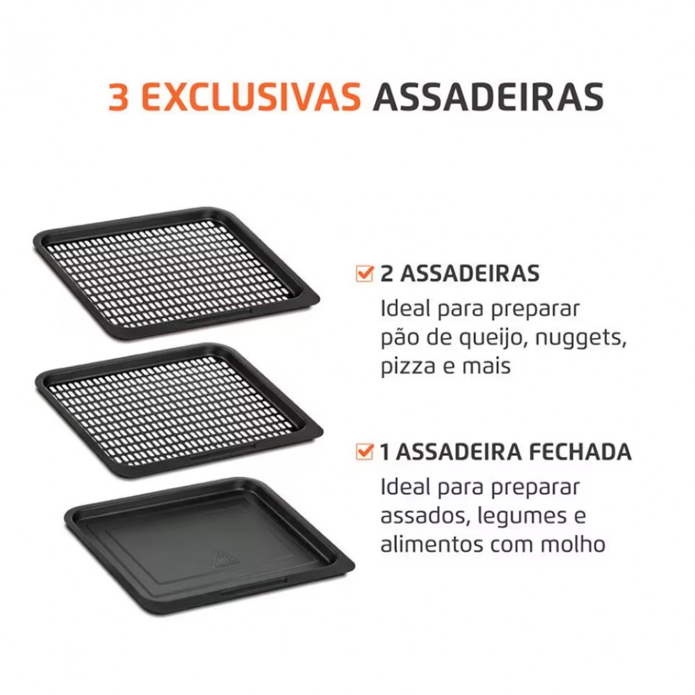 Fritadeira Elétrica Sem Óleo Air Fryer Oven 2 em 1 Mondial AFON 12L BI 12L Digital Air Fryer Oven 2 em 1 Mondial 12 Litros com Painel Digital: tecnologia e inovação para sua cozinha!2 em 1: Air Fryer + Forno: a família de Air Fryers Mondial continua crescendo! O modelo OVEN alia as vantagens da tecnologia da Air Fryer ao espaço e versatilidade do forno. Você pode assar, cozinhar e fritar sem óleo e com perfeição. Cesto de 5 Litros + 3 exclusivas assadeiras: Você tem a opção de usar as três exclusivas assadeiras com antiaderente, que são resistentes e fáceis de usar e limpar. As 2 assadeiras são ideias para pão de queijo, nuggets, pizza, entre outros e 1 assadeira fechada para preparar assados e alimentos com molho. Já o cesto, com capacidade de 5 litros, é indicado para preparar assados, batata frita, bolo e muito mais! E mais! Vem com 10 Funções prédefinidas, potência de 2000W e timer de 90 minutos, garantindo alta performance e praticidade para você cozinhar o que quiser com a praticidade que deseja. Características Gerais: Capacidade total: 12 litros, prepare grandes porções e de uma só vez. São 12 litros de capacidade: a Air Fryer Oven da Mondial é uma gigante na categoria Porta com amplo visor + iluminação interna: praticidade para visualizar as receitas durante o preparo. Função reaquecer Aviso sonoro e desligamento automático Assa, cozinha, gratina e frita os alimentos Painel digital com 10 funções pré definidas: prepare receitas com apenas 1 clique! As funções pré definidas são: Batata, frango, carne, peixe, camarão, pão de queijo, pizza, bolo, legumes e a função reaquecer. Cesto de 5 Litros + 3 exclusivas assadeiras Antiaderente duraflon A Air Fryer é equipada com uma tecnologia que aquece e circula o ar. O ar superquente envolve e cozinha o alimento, sem a necessidade de usar óleo Luva de silicone: mais segurança no preparo Porta fio: não Desligamento automático: sim Cesto removível: Sim Tipo: Sem óleo Quantidade de cestos: 1 Temperatura máxima (°C): 200 Capacidade (litros): 12 (Cesto: 5 Litros) Potência (W): 2.000 (110V) / 2.200 (220V) Tipo de Tomada: 20A (4.8mm) Tipo de Plugue: 3 Pinos Lâmpada piloto: sim Material da Porta: Vidro temperado Conteúdo da Embalagem: 1 Fritadeira 3 Assadeiras 1 Cesto 1 Bandeja coletora 1 Luva de silicone 1 Livro de Receitas 1 Manual de Instruções Garantia: 12 meses Observações: Disponível em 110V e 220V (não é um produto bivolt) Demais produtos que não fazem parte do conteúdo da embalagem, são ilustrativos e não são vendidos com o produto.