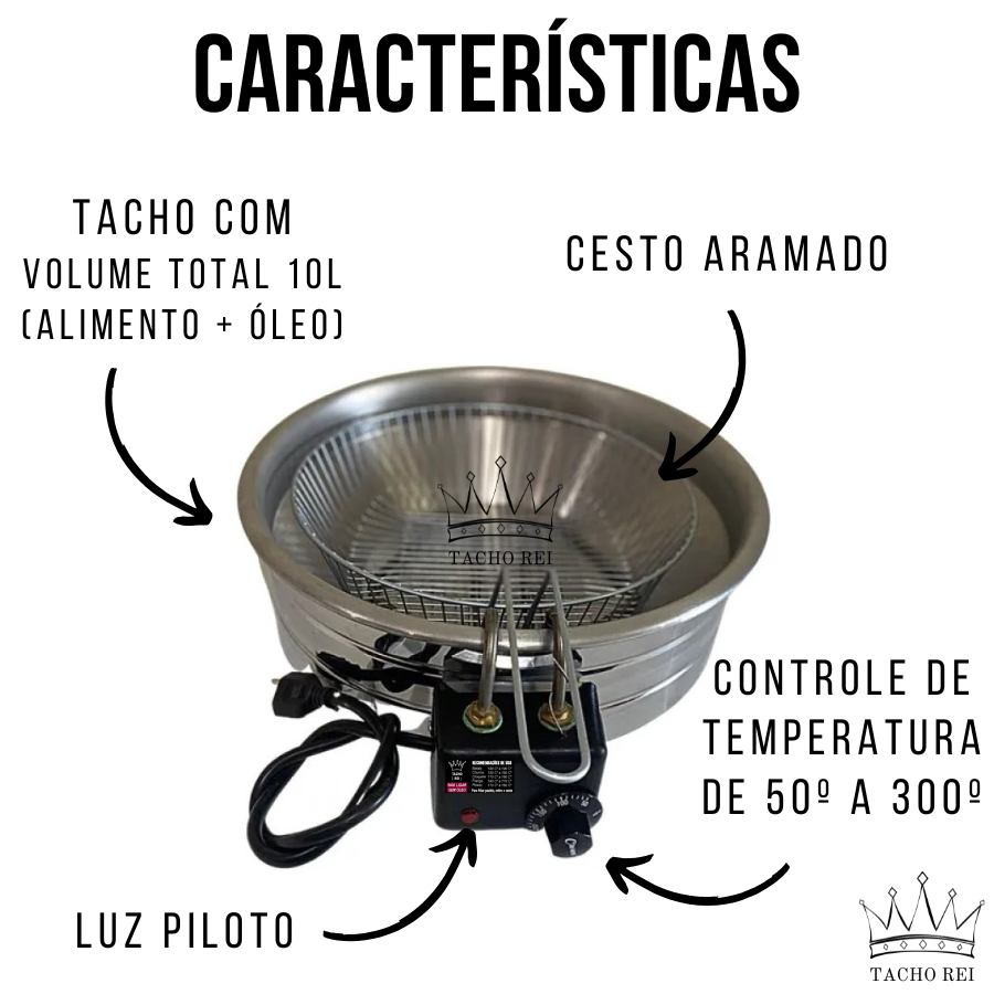 PRODUTO PREMIUM DE QUALIDADE! FOTOS REAIS DO PRODUTO ENVIADO. (Todas as medidas do produto estão nas fotos.) === ATENÇÃO: VEJA AS FOTOS DO ANÚNCIO ANTES DA COMPRA === - Capacidade Total do Tacho: 10 Litros (óleo + alimentos) - Recomendação de uso de óleo: 7 Litros - Termostato de 50°C a 300°C (com regulagem) - Material: Aço Inoxidável - Voltagens 110v e 220v (NÃO É BIVOLT) – Escolher a voltagem no anúncio - Lâmpada piloto de aquecimento (Indicativo de Acionamento Automático) - Cuba em alumínio próprio para gastronomia - Cesto de Fritura aramado próprio para altas temperaturas. Instruções Rápidas: - O controle de temperatura segue a linha da lâmpada de aquecimento. Na dúvida de onde ligar, ouça o "Click". - A fritadeira está ligada quando o piloto acender (luz); - Nunca ligar a fritadeira sem óleo; - Cuidado com a temperatura acima de 200 graus, pode ocorrer queima do óleo; - Para testar a quantidade de óleo, faça a MEDIÇÃO COM ÁGUA e com a fritadeira DESLIGADA. Feito a medição da quantidade, retire a água e seque bem a cuba. JAMAIS LIGUE A FRITADEIRA COM ÁGUA E NEM MISTURE ÁGUA E ÓLEO; - Quando a temperatura indicada for atingida, a fritadeira se desliga e está pronta para ser usada; - A operação de imersão deve ser lenta para que evite que o óleo transborde; - Manter sempre 2 litros de óleo no tacho, isto é, repor quando o nível baixar. A frequência de troca do óleo depende da utilização. Informações técnicas: - 110V – 2.500 Watts - 220V – 2.500 Watts - Tomada: 20A Medidas da Fritadeira: - Tacho Altura: 14,5 cm x Diâmetro Cima: 41,5 cm - Uso Comercial e Residencial - Não incluso tampa CONTEÚDO DA EMBALAGEM: - 01 Base em aço inox - 01 cabeçote com resistência - 01 cesto aramado - 01 Tacho bacia - 01 Manual de instruções PERGUNTAS FREQUENTES: As partes são removíveis? - Sim, todas as partes (cabeçote, cesto, cuba) são removíveis. Quantos graus atinge? - de 50 a 300 graus Quantos litros de óleo? - Recomendamos o uso de 7 Litros (sobrando espaço para os alimentos). Esse valor pode mudar dependendo da quantidade de salgados que irão ser fritos. Posso fritar quais tipos de alimentos? - Quaisquer tipos de alimentos. Salgados, pastel, kibe, mandioca, calabresa, batata, peixes dentre outros. Para pasteis grandes até 24 cm fritar sem o cesto. Usar como tacho de pastelaria. O cesto é aramado? - Sim A tomada é normal? - O plugue é o de 20A Pode ligar diretamente na tomada de casa? - Sim, qualquer tomada normal Quantos watts utiliza? - Utiliza 2500W nas duas voltagens, 110V e 220V