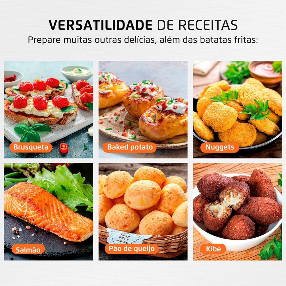A Air Fryer Maxis é a opção perfeita para acrescentar praticidade e versatilidade na sua rotina diária. A fritadeira a ar assa e tosta os alimentos sem precisar adicionar óleo, permitindo uma alimentação mais saudável. Conta com controle de temperatura até 200°C e timer de 60 minutos para facilitar os preparos. Possui capacidade de 4 litros e o cesto é antiaderente e removível, facilitando o uso e a hora da limpeza. Saiba mais sobre a AF-01- MX: Capacidade de 4 Litros: O cesto quadrado acomoda melhor os alimentos, permitindo assar e fritar por igual. Controle de Temperatura até 200°C: Permite a escolha da temperatura ideal para diferentes tipos de alimentos. Timer de 60 Minutos: Facilidade e comodidade de selecionar o tempo necessário de preparo das receitas. Antiaderente: O cesto possui revestimento antiaderente e os alimentos não grudam no fundo. Fácil de Limpar: A limpeza da parte interna é fácil, pois a cuba e o cesto são removíveis. Alimentação Mais Saudável: Por não precisar de óleo ou manteiga, você pode preparar alimentos saborosos e mais saudáveis. Lâmpadas-Piloto: A luz vermelha sinaliza que o produto está ligado. A luz verde, indica que atingiu a temperatura ideal e está pronto para usar. Aviso Sonoro + Desligamento Automático: Após o tempo predefinido no Timer, há um aviso sonoro e a fritadeira desliga automaticamente. Versatilidade de Receitas: Prepare muito mais que batata frita! Com a air fryer Maxis é possível fazer carne, frango, peixe, pão de queijo, batata recheada e muito mais.