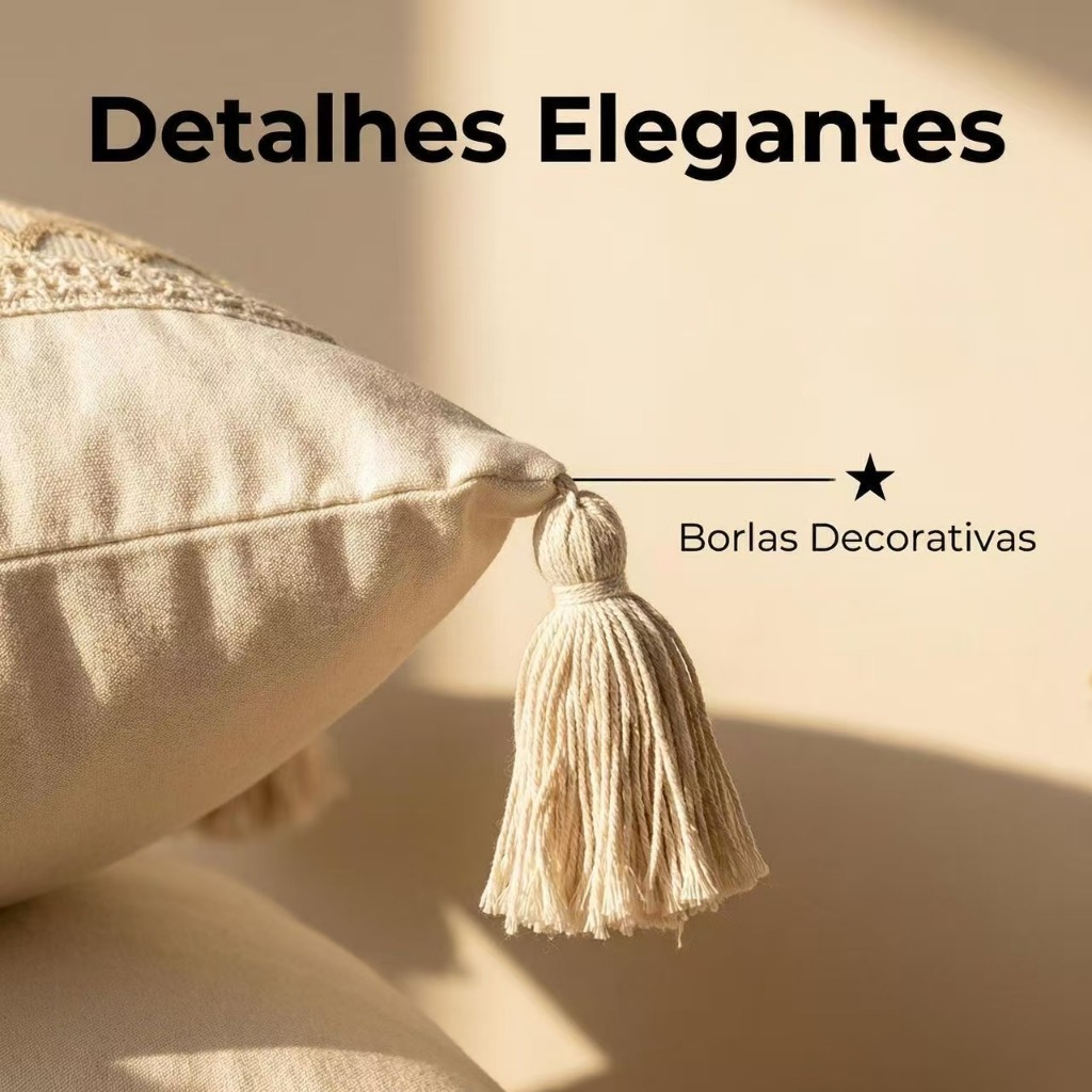 Fronha Decorativa Boêmia 45x45cm com Textura 3D, Feita à Mão, Zíper Invisível (Enchimento Não Incluso) Adicione um toque elegante, confortável e personalizado à sua casa. Esta fronha decorativa boêmia foi criada para quem aprecia detalhes artesanais, design sofisticado e um ambiente acolhedor. Inspirada na natureza e nas tendências modernas, é perfeita para salas de estar, quartos, varandas, escritórios e espaços de relaxamento. ✨ Design Boêmio Atemporal O estilo boêmio é conhecido por suas texturas ricas, tons neutros e elementos artesanais. Esta fronha tem um visual leve e elegante, ideal para estilos modernos, rústicos, escandinavos ou minimalistas. Seu design texturizado cria profundidade visual, adicionando charme a qualquer ambiente sem sobrecarregar. 🧶 Textura 3D Premium, Feita à Mão A parte frontal da fronha apresenta uma textura 3D ricamente detalhada, com um padrão cuidadosamente elaborado que lhe confere um toque artesanal refinado. Cada detalhe foi meticulosamente pensado para apresentar beleza, realismo e uma experiência visual única. O trabalho artesanal garante: Aparência elegante Toque confortável Estilo exclusivo e refinado 🎀 Delicadas franjas decorativas As franjas decorativas nos cantos são um dos destaques deste produto. Elas trazem dinamismo, leveza e um toque artesanal, realçando ainda mais a estética geral do produto, tornando-o ideal para quem busca uma decoração única e charmosa. 🔒 Zíper invisível O design com zíper invisível oferece: Um visual limpo e sofisticado Fácil troca da fronha Um melhor efeito visual O zíper é resistente, durável e invisível, sem afetar o design geral da almofada. 🌿 Toque macio e confortável O tecido é macio e confortável ao toque, ideal para relaxar. Esta capa de almofada se adapta perfeitamente às suas costas e pode adornar sofás, poltronas, camas ou bancos, combinando conforto e estilo. 🏠 Ideal para diversos ambientes Esta capa de almofada decorativa é perfeita para: Sala de estar Quarto Varanda Escritório Cantinho de leitura Ambientes comerciais Combina facilmente com tapetes, mantas, cortinas e outros elementos, como móveis de madeira. 🏠 Ideal para diversos ambientes 📏 Especificações do Produto Produto: Fronha Decorativa Estilo: Boêmio Tamanho: 45 x 45 cm Material: Tecido Premium, Feito à Mão Textura: Tridimensional Fecho: Zíper Invisível Detalhes: Franjas Decorativas Conteúdo da Embalagem: 1 Fronha Enchimento: ❌ Não Incluso 🧼 Instruções de Lavagem e Cuidados Lavar à mão ou em ciclo delicado na máquina Usar água fria Não usar alvejante Secar à sombra Não torcer Estas instruções de lavagem e cuidados ajudam a manter a textura, a cor e os detalhes artesanais da fronha por mais tempo. 💡 Por que escolher esta fronha? ✔ Design moderno e elegante ✔ Estilo boêmio sofisticado ✔ Textura 3D exclusiva ✔ Acabamento impecável ✔ Zíper invisível ✔ Combina facilmente com diversos estilos de decoração Adicione charme, conforto e sofisticação à sua casa; a escolha perfeita para renovar o seu lar.