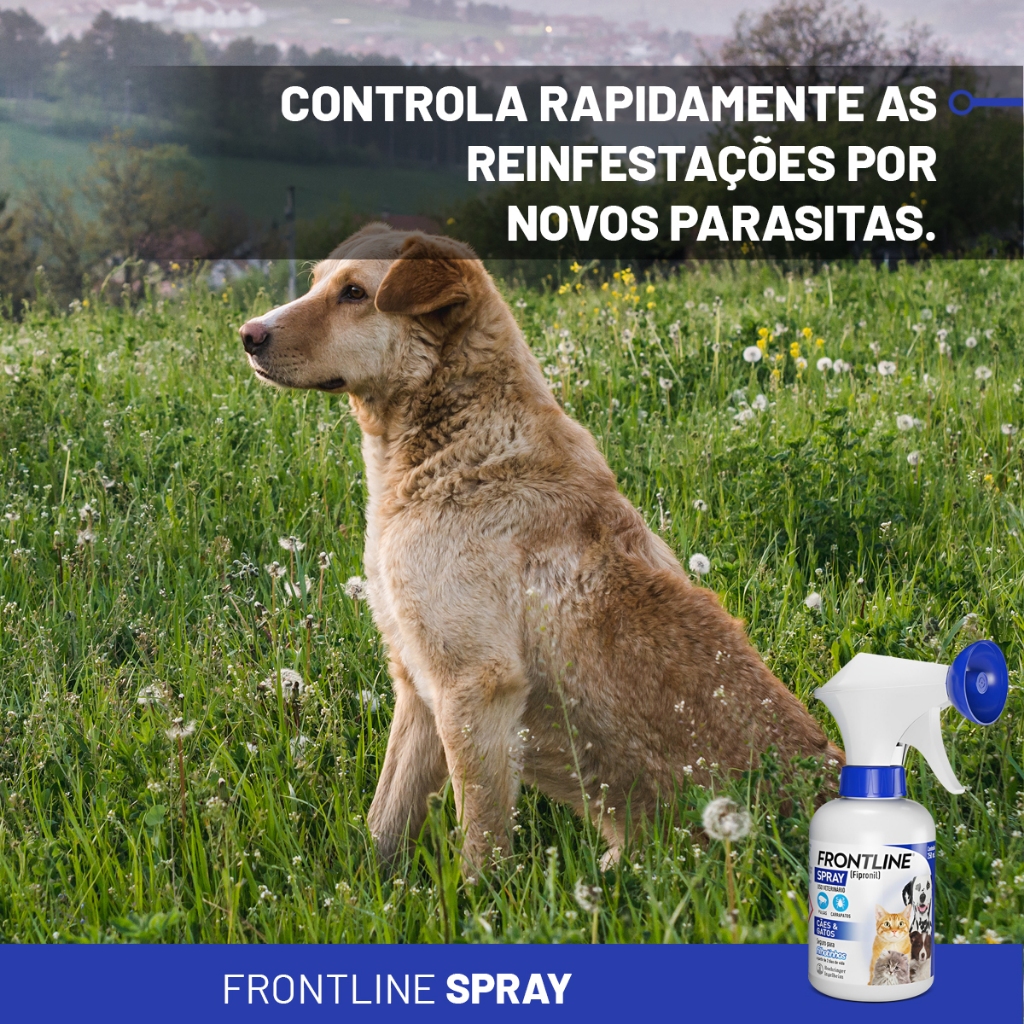 Antipulgas e Carrapatos Frontline Spray para Cães e Gatos Indicação: O Frontline Spray Cães e Gatos tem como princípio ativo a molécula Fipronil e atua no controle de infestações por pulgas e carrapatos. Este produto é pensado para cachorros e gatos a partir de 2 dias de vida. É fácil de aplicar e tem alto poder de absorção. Frontline Spray é indicado somente para uso externo e pode ser aplicado também em fêmeas lactantes. Seu período de ação é de 1 mês contra pulgas e carrapatos. Recomendações: Para melhor eficácia, a frequência e modo de uso de qualquer produto da linha Frontline devem ser seguidos conforme recomendado em bula. O produto Frontline Spray não deve ser aplicado em outras espécies de animais. Evite contato do medicamento com regiões de risco, como olhos e boca. Em casos de reações adversas ao tratamento, suspenda o uso e retorne ao veterinário imediatamente. Siga sempre a dosagem recomendada. Aconselha-se realizar limpeza completa do ambiente para auxiliar no controle de parasitas. Uso: 1) Regular o jato de pulverização girando a válvula azul. 2) Umedecer completamente toda a pele e pelos do animal com Frontline Spray, para que o tratamento seja eficaz. 3) Pulverizar o produto no sentido contrário ao do crescimento dos pelos para uma melhor distribuição. 4) Massagear os pelos durante a aplicação para que o produto atinja a pele - luvas podem facilitar esta tarefa. 5) Para aplicar na região da cabeça, borrifar o produto nas luvas e esfregar suavemente na face do animal, evitando a região dos olhos. 6) Deixar o produto secar naturalmente. Frontline Spray deve ser aplicado em todo o corpo do animal. É importante não esquecer da barriga, patas e cauda.