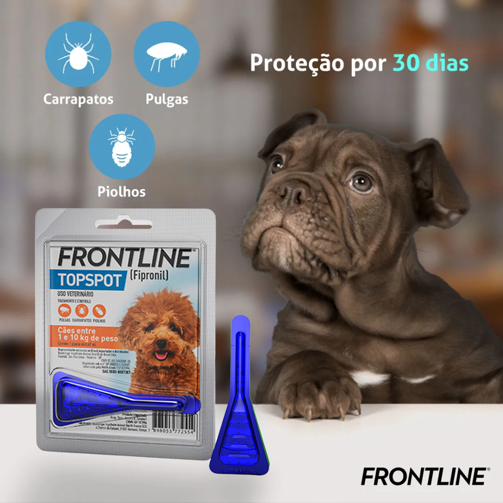 🐶✨ Frontline TopSpot Cães – 1 a 10kg Proteção prática e eficaz para cães que vivem em ambientes de baixo risco de infestação 🛡️ Produzido pela Boehringer Ingelheim, Frontline TopSpot faz parte da família Frontline e foi desenvolvido para garantir saúde, conforto e bem-estar ao seu pet 💙 ✅ Informações Gerais 🐾 Elimina rapidamente pulgas, carrapatos e piolhos 🐾 Proteção por até 30 dias 🐾 Indicado para cães de 1 a 10kg 🐾 Pode ser aplicado a partir de 8 semanas de idade 🐾 Seguro para cadelas gestantes e em lactação 🐾 Ideal para cães caseiros 📌 Modo de Uso 1️⃣ Quebre a ponta da pipeta na linha tracejada 2️⃣ Afaste o pelo entre a nuca e a base do pescoço até aparecer a pele 3️⃣ Encoste a pipeta na pele e aplique o conteúdo em vários pontos, evitando que escorra 🔔 Para melhor efeito residual, evite banho 48h antes e após a aplicação. ⚠️ Recomendações Importantes ❗ Utilize conforme as orientações da bula ❗ Uso exclusivo para cães ❗ Não aplicar em outras espécies ❗ Evite contato com olhos e boca ❗ Em caso de reação adversa, suspenda o uso e procure um veterinário