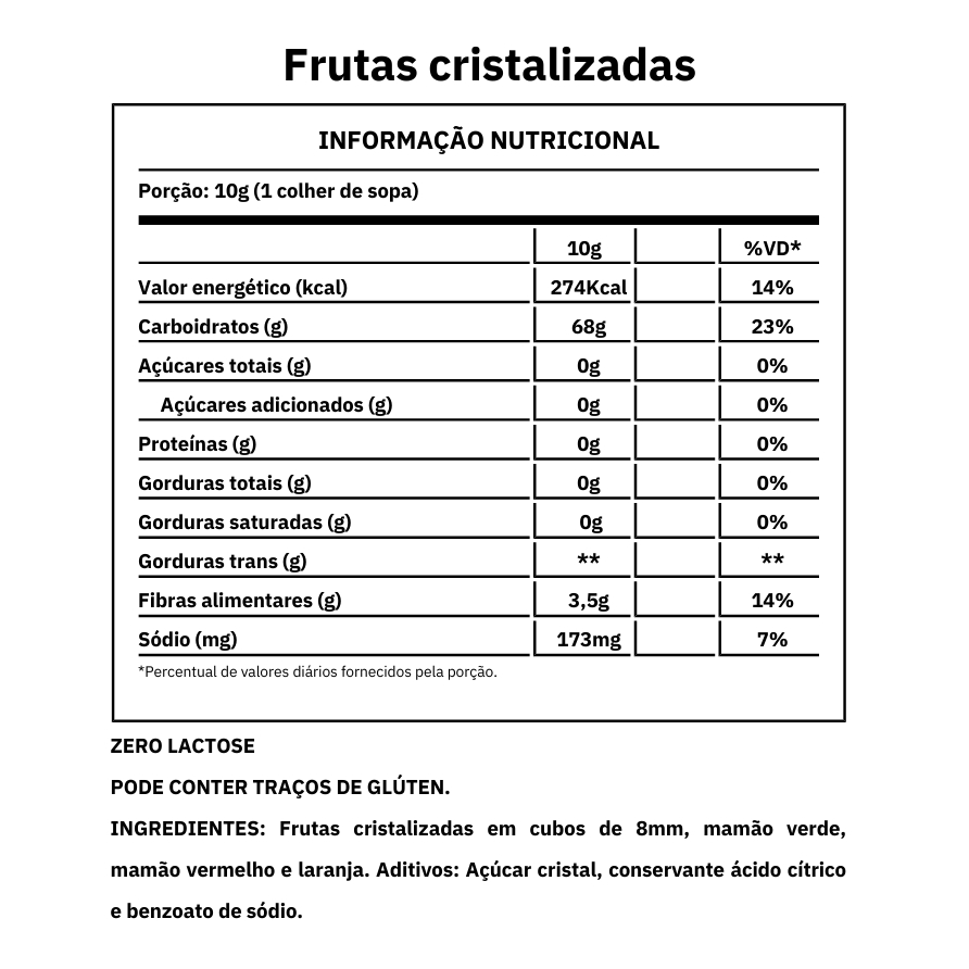 Produzida a partir de diferentes frutas cortadas em pequenos cubinhos, as Frutas Cristalizadas são presença assídua principalmente nas festividades do final do ano. Explicando de forma simples, a cristalização é um processo de conservação da fruta, tornando-as mais duradouras e levemente adocicadas. Este processo de cristalização da fruta consiste em substituir quase toda a água da fruta por uma calda de açúcar, que impede que a fruta se deteriore, mantendo-a própria para consumo durante muito mais tempo. INGREDIENTES: Frutas cristalizadas em cubos de 8mm, mamão verde, mamão vermelho e laranja. Aditivos: Açúcar cristal, conservante ácido cítrico e benzoato de sódio. ALÉRGICOS: PODE CONTER TRAÇOS DE GLÚTEN, LEITE, SOJA, AMENDOIM E CACAU POR CONTAMINAÇÃO CRUZADA. INFORMAÇÕES ADICIONAIS - PODE HAVER VARIAÇÃO DE COR DEPENDENDO DO LOTE. - EMBALAGEM MERAMENTE ILUSTRATIVA