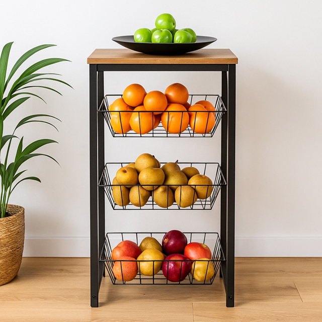 Fruteira de Chão Amadeirado Cestos Removíveis Suporta 50Kg Preto Fosco Aço