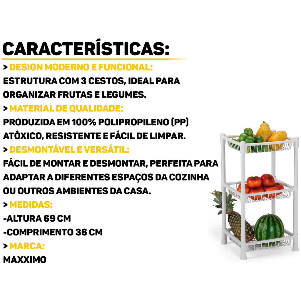 Fruteira Desmontável 3 Cestos Branca Máxximo Mantenha suas frutas e legumes sempre organizados com a Fruteira Máxximo. Com design moderno e funcional, ela é ideal para otimizar espaços, trazendo mais praticidade ao dia a dia. Conta com 3 cestos espaçosos e arejados, que facilitam a visualização e a circulação de ar, ajudando a conservar melhor os alimentos. Compacta e versátil, é perfeita para otimizar espaço. Características: > Design elegante e prático; > Leve, funcional e decorativa; > Ideal para cozinhas e despensas; > Possui quatro andares, sendo ideal para pequenos e grandes espaços; > Possui acabamento na cor branca, que combina com qualquer estilo de ambiente. Especificações Técnicas: > Material: plástico; > Dimensões do produto (C x L x A): 69cm x 36cm x 32cm. - Marca: Máxximo - Garantia: 90 dias contra defeitos de fabricação Vantagens de comprar na Brester: - Produto a pronta entrega. - Produto novo, com garantia de fábrica. - Nota fiscal para Pessoa Física e Pessoa Jurídica.