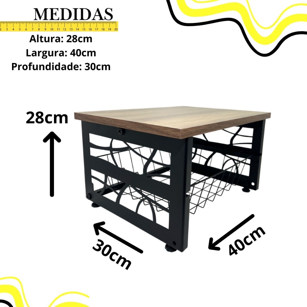 Olá! Seja bem vindo a Casa Decor. Somos uma empresa voltada ao ramo de utilidades domésticas. Prezando sempre ao bem estar e elegancia da sua casa, que é um refúgio de tranquilidade e relaxamento. E, para transformar esse espaço você precisa dos acessórios certos. Fruteira multiuso com um cesto deslizante. Pode ser utilizada em vários ambientes, cozinha, banheiro, quarto, facilitando seu dia-a-dia. Seu tampo em Mdf (superfície superior), permite sua utilização para diversas outras possibilidades, como a utilização de arranjos ou até mesmo de utensílios domésticos, galão de agua , micro-ondas, etc. Ideal para deixar em cima da mesa, no canto da pia, do armário, o que lhe proporciona um excelente custo-benefício, e além de linda, vai dar um charme para sua casa. Dimensões: Altura - 28cm Largura - 40cm Profundidade - 30cm - Cor da estrutura: Preto fosco - Cor do MDF: Amadeirado | Branco | Preto (escolher a cor que deseja) - Material: Aço e MDF. Garantia de fábrica. 3 meses contra defeito de fabricação.