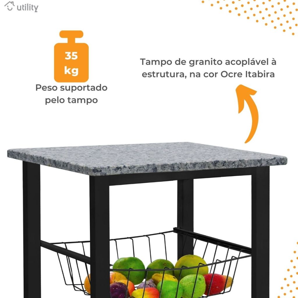 Fruteira Max Forte Tampo de Granito 3 Cestos Removíveis Pret
