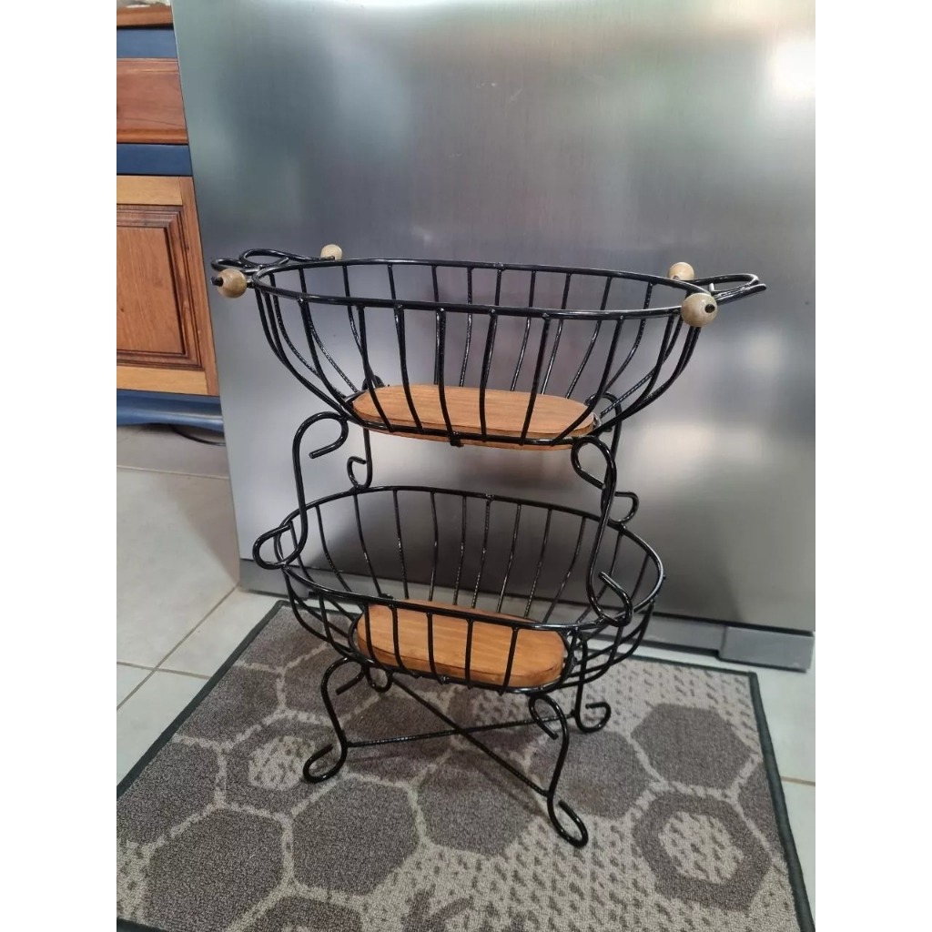 fruteira oval de dois andares em ferro e madeira