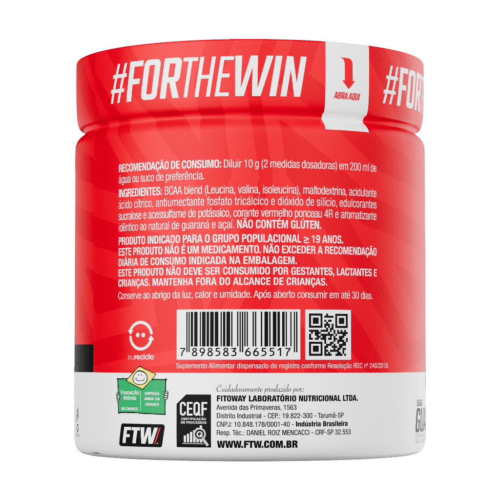 BCAA 10:1:1 da FTW é um suplemento alimentar em pó composto por aminoácidos de cadeia ramificada (L-Leucina, L-Valina e L-Isoleucina) na proporção 10:1:1, com predominância de L-Leucina. A fórmula também contém Vitamina B6, que participa do metabolismo de proteínas e aminoácidos. É indicado para complementar a ingestão desses nutrientes, especialmente em dietas com foco no aporte de aminoácidos essenciais, conforme orientação de profissional da saúde ou nutricionista. Ingredientes BCAA Blend (L-Leucina, L-Valina, L-Isoleucina), maltodextrina, piridoxina (Vitamina B6), acidulante ácido cítrico, antiumectantes (fosfato tricálcico e dióxido de silício), edulcorantes (sucralose e acessulfame de potássio), corante e aromatizante idêntico ao natural. NÃO CONTÉM GLÚTEN. Apresentação Pote com 300g Porção: 10g (2 medidas dosadoras) ao dia. Rendimento: Cerca de 30 porções. Como Consumir Diluir 10g (2 medidas dosadoras) em 200ml de água ou suco de preferência. Consumir antes, durante ou após os treinos, conforme recomendação do nutricionista ou profissional da saúde. Informações Adicionais Produto indicado para maiores de 19 anos; Este produto não deve ser consumido por gestantes, lactantes e crianças; Mantenha fora do alcance de crianças; Não exceder a recomendação diária de consumo indicada na embalagem; Conservar em local seco e fresco, ao abrigo da luz e umidade; Após aberto consumir em até 60 dias; Este produto não é um medicamento. Certificação Suplemento alimentar dispensado de registro conforme Resolução RDC nº 240/2018. Alegações baseadas no Anexo V da IN 28 Anvisa.
