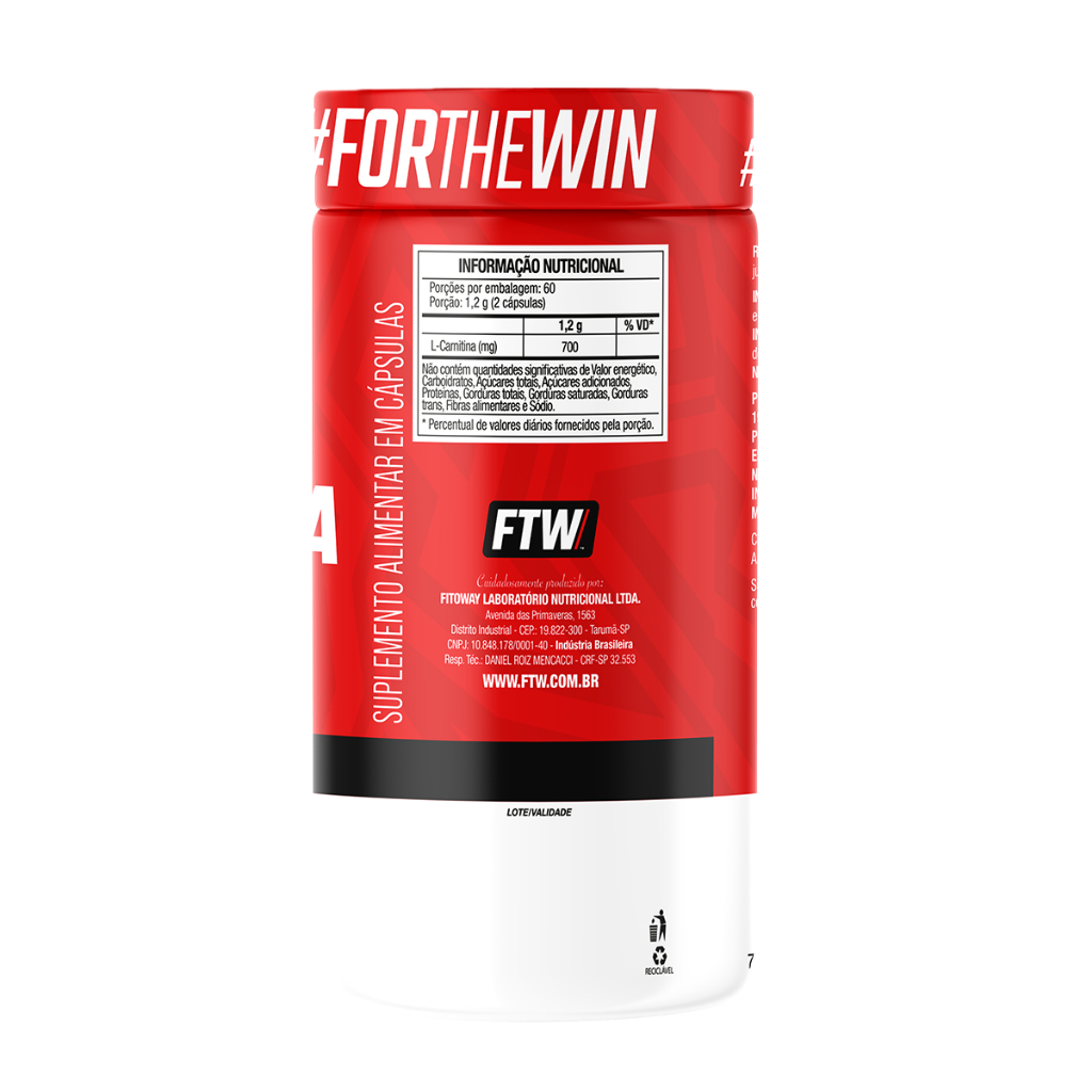 Descrição Completa do Produto L-Carnitina 700mg 120 Cápsulas - FTW O que é / Para que serve L-Carnitina 700mg da FTW é um suplemento alimentar em cápsulas composto por L-carnitina, um composto nitrogenado sintetizado a partir dos aminoácidos lisina e metionina. A L-carnitina está naturalmente presente no corpo humano, especialmente em tecidos que utilizam ácidos graxos como fonte de energia. Este suplemento é indicado para complementar a ingestão dessa substância em dietas com necessidades nutricionais específicas, especialmente voltadas à prática esportiva ou controle metabólico, conforme orientação profissional. Ingredientes L-Carnitina, estabilizantes (celulose microcristalina e amido), antiumectantes (dióxido de silício e fosfato tricálcico). Ingredientes da cápsula: Celulose, opacificante dióxido de titânio e água potável filtrada. NÃO CONTÉM GLÚTEN. Apresentação Pote com 120 cápsulas Porção: 2 cápsulas ao dia Rendimento: Cerca de 60 porções. Como Consumir Ingerir 2 cápsulas ao dia, preferencialmente junto às refeições, ou conforme orientação de nutricionista ou profissional da saúde. Informações Adicionais Produto indicado para maiores de 19 anos; Este produto não deve ser consumido por gestantes, lactantes e crianças; Mantenha fora do alcance de crianças; Não exceder a recomendação diária de consumo indicada na embalagem; Conservar em local seco e fresco, ao abrigo da luz e umidade; Após aberto consumir em até 90 dias; Este produto não é um medicamento. Certificação Suplemento alimentar dispensado de registro conforme Resolução RDC nº 240/2018. Alegações baseadas no Anexo V da IN 28 Anvisa.