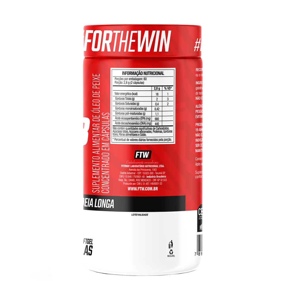 Descrição Completa do Produto Ômega 3 MEG-3® 120 Cápsulas - FTW O que é / Para que serve Ômega 3 MEG-3® da FTW é um suplemento alimentar em cápsulas, composto por óleo de peixe, fonte dos ácidos graxos poli-insaturados da família ômega 3, como EPA (ácido eicosapentaenoico) e DHA (ácido docosahexaenoico). É indicado para complementar a ingestão diária desses nutrientes na alimentação, conforme recomendação de profissionais de saúde ou nutricionistas. Ingredientes Óleo de peixe, gelatina, glicerol (umectante), água purificada, antioxidante (mistura concentrada de tocoferóis). NÃO CONTÉM GLÚTEN. NÃO CONTÉM LACTOSE. ALÉRGICOS: Contém derivados de peixe e soja. Pessoas alérgicas a peixes e crustáceos devem evitar o consumo deste produto. Apresentação Pote com 120 cápsulas Porção: 2 cápsulas ao dia Rendimento: Cerca de 60 porções. Como Consumir Ingerir 2 cápsulas ao dia, com auxílio de líquido. O consumo deste produto deve ser orientado por profissional da saúde. Informações Adicionais Produto indicado para maiores de 19 anos; Este produto não deve ser consumido por gestantes, lactantes e crianças; Este produto não é um medicamento; Não exceder a recomendação diária de consumo indicada na embalagem; Mantenha fora do alcance de crianças; Conservar em local seco e fresco, ao abrigo da luz e umidade; Após abrir consumir em até 60 dias. Certificação Suplemento alimentar dispensado de registro conforme Resolução RDC nº 240/2018. Alegações baseadas no Anexo V da IN 28 Anvisa.