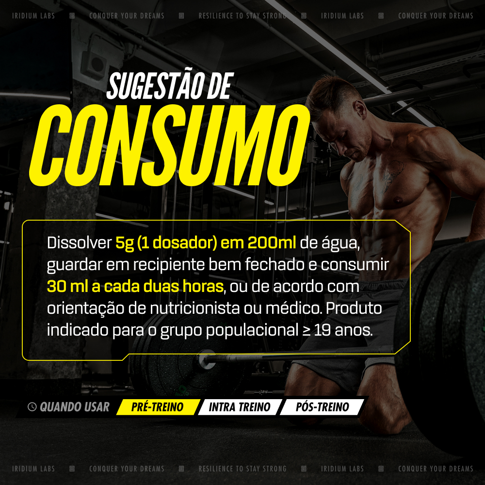 Pré Treino - Full Tilt 150g - Iridium Labs * ESTE PRODUTO NÃO É UM MEDICAMENTO. Suplemento esportivo Esse tipo de suplemento ajuda a complementar a alimentação de pessoas com objetivos ou requisitos nutricionais específicos. Seu consumo pode ser indicado por vários fatores, como a duração e a intensidade da atividade física, o tipo de esporte, o ambiente em que é praticado, a idade, a composição corporal, o peso, etc. É importante destacar que seu uso deve ser acompanhado por uma alimentação equilibrada e hábitos de vida saudáveis. ""Full Tilt é uma combinação de 2.000mg de Beta Alanina, 200mg de Cafeína e Vitaminas do Complexo B. A cafeína auxilia no aumento do estado de alerta e na melhora da concentração. A cafeína auxilia no aumento da capacidade de resistência e no desempenho de exercícios físicos de resistência."" A cafeína auxilia no aumento do estado de alerta e na melhora da concentração. A cafeína auxilia no aumento da capacidade de resistência e no desempenho de exercícios físicos de resistência. A vitamina B6 auxilia no funcionamento do sistema imune. A vitamina B6 auxilia no metabolismo energético. A vitamina B6 auxilia no metabolismo de proteínas e do glicogênio. A vitamina B6 auxilia no metabolismo de proteínas, carboidratos e gorduras. A vitamina B6 auxilia na síntese de cisteína. 1) Alegação: A niacina contribui para a manutenção da pele. A niacina auxilia na manutenção de mucosas. A niacina auxilia no metabolismo energético. A niacina auxilia no metabolismo de proteínas, carboidratos e gorduras. O magnésio auxilia na formação de ossos e dentes. O Ácido Fólico auxilia na sintese de aminoácios. A vitamina B12 auxilia na formação de células vermelhas do sangue. A vitamina B12 auxilia no funcionamento do sistema imune. A vitamina B12 auxilia no metabolismo energético. A vitamina B12 auxilia no metabolismo dos carboidratos, proteínas e gorduras. Ingredientes: Beta alanina, maltodextrina, aroma idêntico ao natural sabor abacaxi, cafeína, acidulante ácido cítrico, mix de vitaminas e minerais [vitamina B6 (cloridrato de piridoxina), vitamina B12 (cobalamina), vitamina B3 (ácido nicotínico)], edulcorante sucralose. Antiumectante: dióxido de silício. Corantes artificiais: amarelo tartrazina e amarelo crepúsculo. NÃO CONTÉM GLÚTEN. Atlas Creatina - 90g - Iridium Labs A creatina é um dos suplementos mais estudados do mundo, tanto para a eficácia quanto para a segurança. A suplementação de creatina pode ser indicada para praticantes de atividade física por sua atividade benéfica. A creatina auxilia no aumento do desempenho físico durante exercícios repetidos de curta duração e alta intensidade. ""Este produto não deve ser consumido por gestantes, lactantes e crianças"" deve constar na rotulagem do produto. Ingredientes: Creatina Monohidratada em pó. NÃO CONTÉM GLÚTEN. NÃO CONTÉM LACTOSE. CARACTERÍSTICAS: CREATINA EM PÓ ZERO AÇÚCAR ZERO SÓDIO