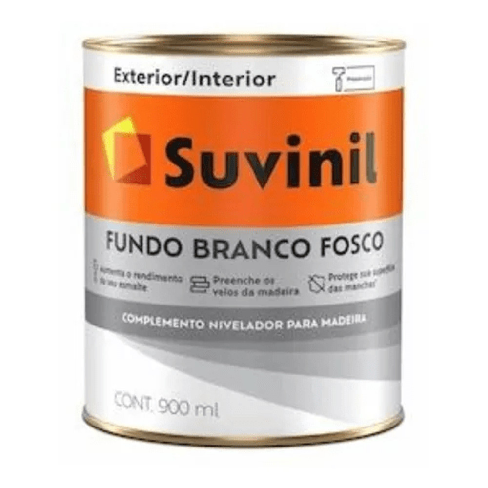 Suvinil Fundo Branco Fosco é um nivelador pensado para madeiras. Um complemento que preenche os veios e sela a superfície. Lixar a madeira para pintar vai ficar mais fácil e o acabamento e rendimento do esmalte ficará melhor. Além disso, ele também ajuda a proteger paredes e forros de gesso manchadas. - Marca : Suvinil. - Embalagem : Lata 900 Ml. - Cor : Branco Fosco. - Diluição : Pintura sobre madeira: dilua com 20 a 30% de aguarrás. Para aplicação com pistola diluir com 30% de aguarrás, pressão entre 2,2 e 2,8Kgf/cm² ou 30 a 35lbs/pol². - Rendimento por demão : Rendimento até 8 m². - Rendimento acabado : Rendimento até 8 m². - Quantidade necessária de demãos : 2 a 3. - Secagem : Ao toque 4 horas. Entre demãos 12 horas. Final 24 horas. FUNDO BRANCO FOSCO 900ML SUVINIL