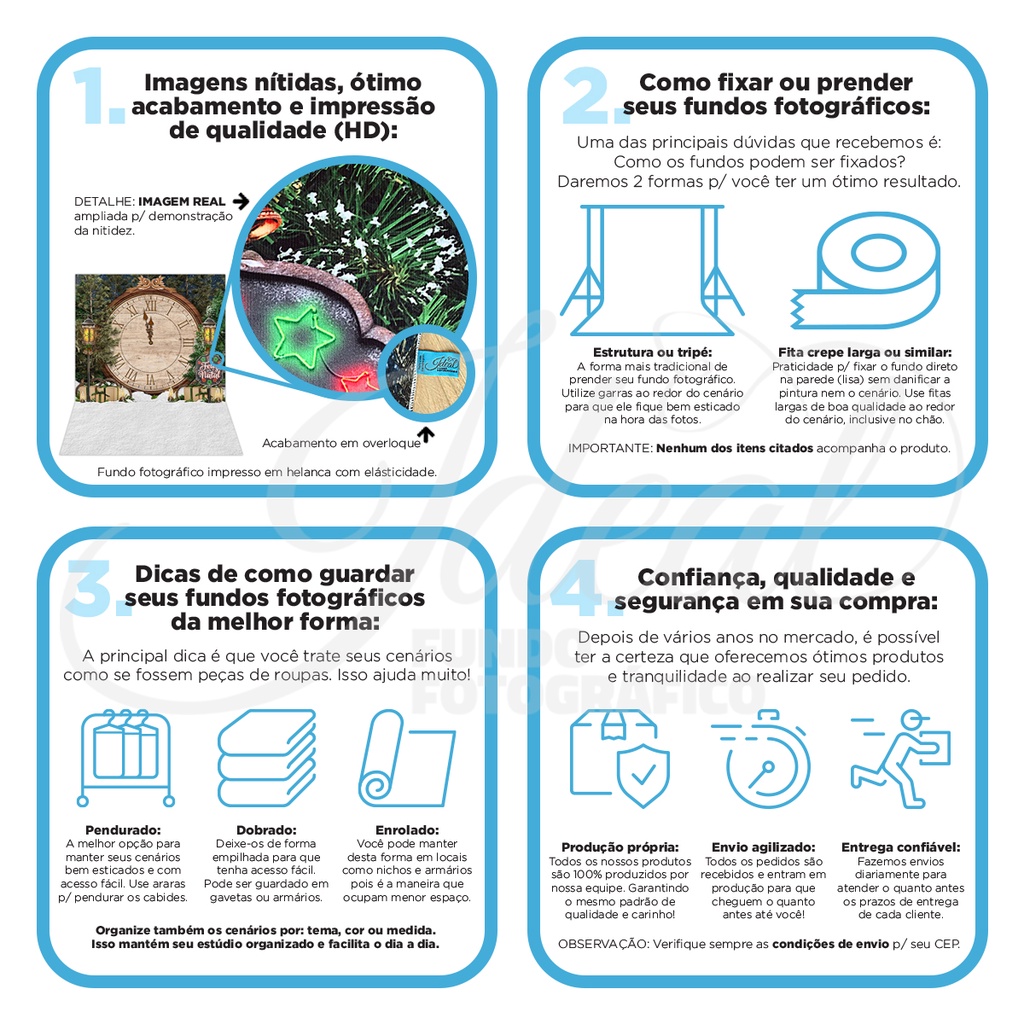 Todos os nossos Fundos Fotográficos Sublimados são confeccionados em tecido especial, com excelente acabamento e imagens nítidas que possibilitam fotos incríveis sem reflexos no resultado final. Por serem muito práticos, os fundos podem ser utilizados em estruturas como tripés (presos por garras) ou fixado em paredes e até mesmo placas de MDF com o auxílio de fita crepe ou dupla face (de formato largo, preferencialmente). Características: Tecido: Malha (estica e não amassa) Composição: 95% Poliéster + 5% elastano Gramatura: 140g m² Acabamento: Pode ser em overloque ou à laser, à depender da demanda. Ambos com acabamento perfeito que garantem sua durabilidade. ** Itens inclusos: 1 fundo fotográfico em tecido Malha ** Indicação de uso: Produção de fotos em estúdio fotográfico Informação complementar: As cores podem variar nas fotografias devido à qualidade da câmera fotográfica, ajustes/configurações da câmera, lente e iluminação do ambiente. Além disso, as configurações brilho e contraste do monitor ou celular onde a imagem está sendo visualizada, também podem dar a impressão das cores serem mais ou menos vivas, mais ou menos intensas. ** Todos os nossos produtos passam pelo processo de sublimação, sendo uma etapa onde passam por uma temperatura muito alta, podendo ter uma pequena variação em seu tamanho de até 5cm.** Nossos fundos fotográficos têm uma qualidade incomparável e é simplesmente incrível! Nosso tecido é maravilhoso, proporciona um toque suave e sem marcas de dobras, as cores são bem vivas e a nitidez da resolução incrível. Praticidade e economia de espaço, podem ser lavados, dobrados, guardados e é só esticar e arrasar nas fotografias. Possui acabamento impecável, não desbota e o caimento é perfeito! Uma combinação de qualidades especiais.