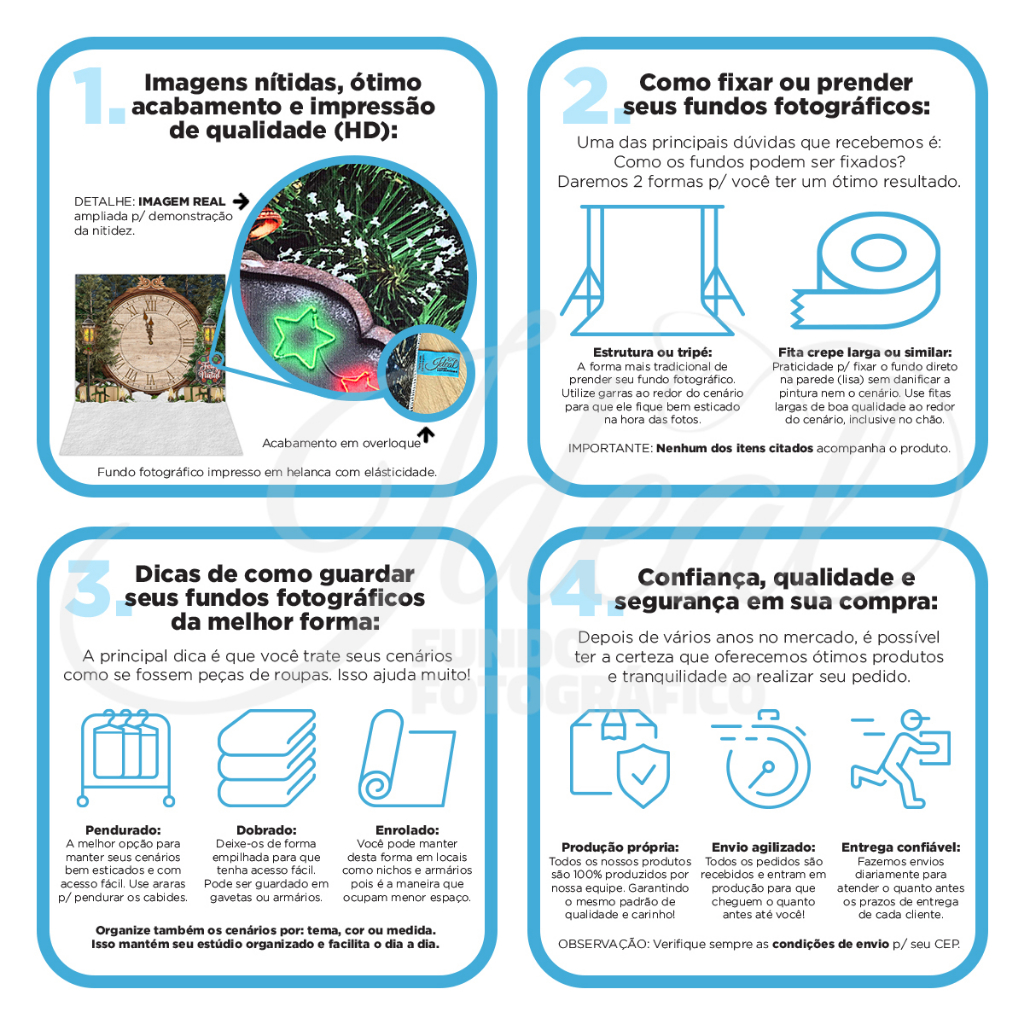 Todos os nossos Fundos Fotográficos Sublimados são confeccionados em tecido especial, com excelente acabamento e imagens nítidas que possibilitam fotos incríveis sem reflexos no resultado final. Por serem muito práticos, os fundos podem ser utilizados em estruturas como tripés (presos por garras) ou fixado em paredes e até mesmo placas de MDF com o auxílio de fita crepe ou dupla face (de formato largo, preferencialmente). Características: Tecido: Malha (estica e não amassa) Composição: 95% Poliéster + 5% elastano Gramatura: 140g m² • ACABAMENTO: Pode ser em overloque ou à laser, à depender da demanda. Ambos com acabamento perfeito que garantem sua durabilidade. ** Itens inclusos: 1 fundo fotográfico em tecido Malha ** Indicação de uso: Produção de fotos em estúdio fotográfico Informação complementar: As cores podem variar nas fotografias devido à qualidade da câmera fotográfica, ajustes/configurações da câmera, lente e iluminação do ambiente. Além disso, as configurações brilho e contraste do monitor ou celular onde a imagem está sendo visualizada, também podem dar a impressão das cores serem mais ou menos vivas, mais ou menos intensas. ** Todos os nossos produtos passam pelo processo de sublimação, sendo uma etapa onde passam por uma temperatura muito alta, podendo ter uma pequena variação em seu tamanho de até 5cm.** Nossos fundos fotográficos têm uma qualidade incomparável e é simplesmente incrível! Nosso tecido é maravilhoso, proporciona um toque suave e sem marcas de dobras, as cores são bem vivas e a nitidez da resolução incrível. Praticidade e economia de espaço, podem ser lavados, dobrados, guardados e é só esticar e arrasar nas fotografias. Possui acabamento impecável, não desbota e o caimento é perfeito! Uma combinação de qualidades especiais.