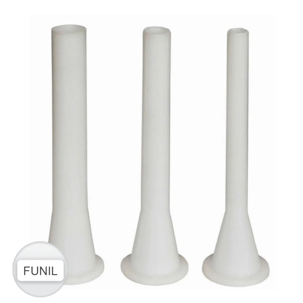 Funil (FINO/MEDIO/GROSSO) para ensacadeira confira abaixo as medidas: FUNIL FINO 19 cm (ALT) X 1,6 cm ( diâmetro da saída) X 5 cm ( diâmetro da entrada) FUNIL MEDIO 20 cm (ALT) X 2 cm ( diâmetro da saída) X 5 cm ( diâmetro da entrada) FUNIL GROSSO 20 cm (ALT) X 2,5 cm ( diâmetro da saída) X 5 cm ( diâmetro da entrada) ATENÇÃO: ESTE PRODUTO NÃO SERVE PARA MOEDORES DE CARNE, SEU USO É EXCLUSIVO PARA EMSACADEIRAS DE LINGUIÇA 8/5 LITROS